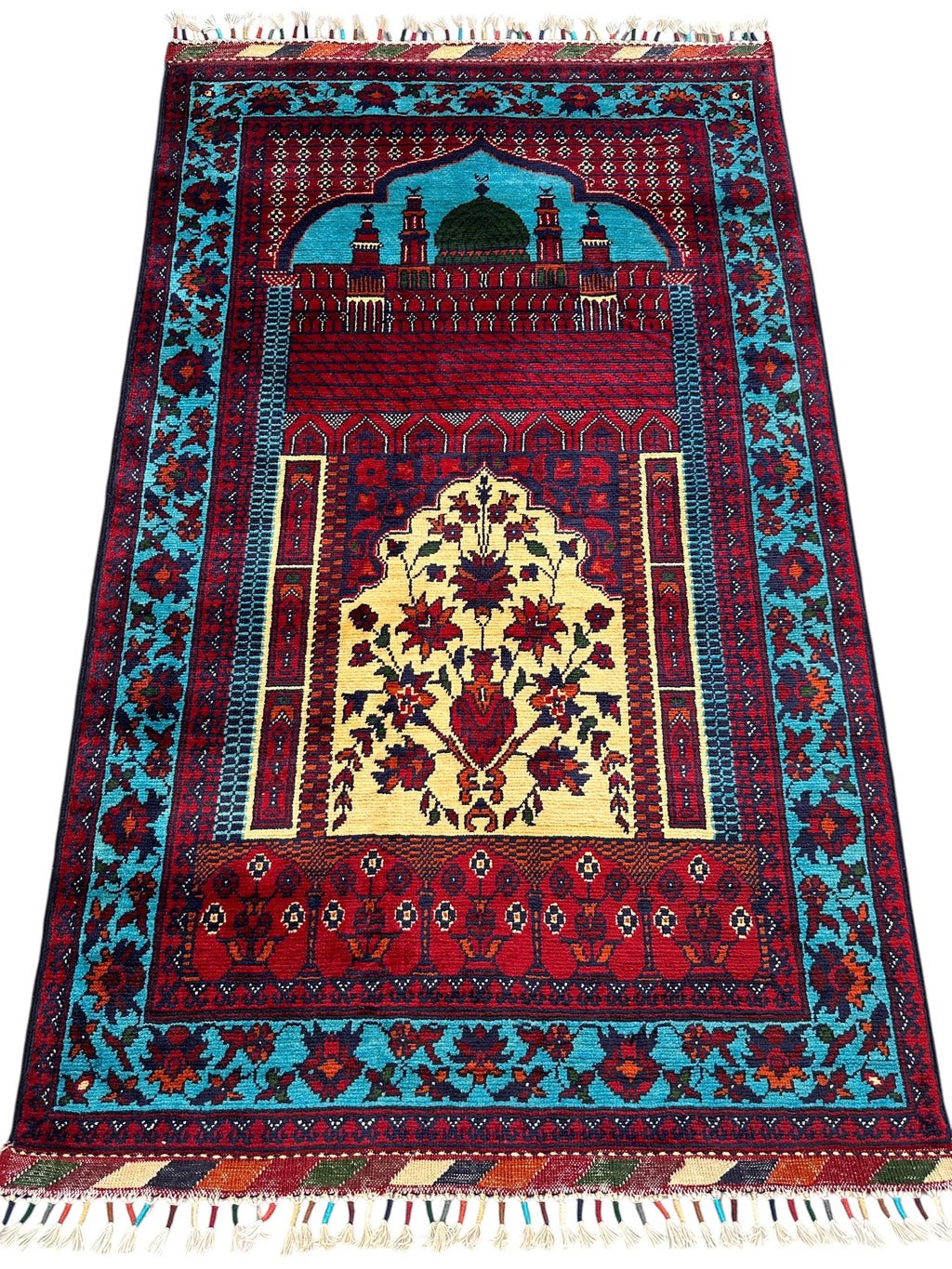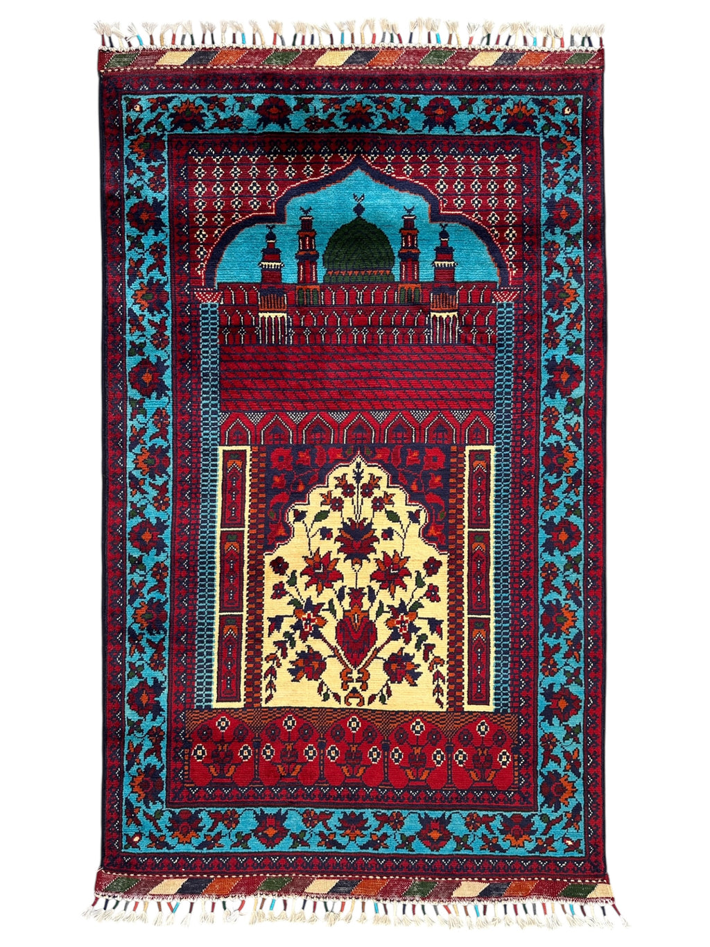 Keywords: hand-knotted wool prayer rug, Islamic mihrab design carpet, Afghan handmade prayer mat, traditional Muslim prayer rug, artisanal wool rug, collectible oriental rug, special Rugistan fringe, handmade wool prayer mat, vintage-inspired Islamic carpet