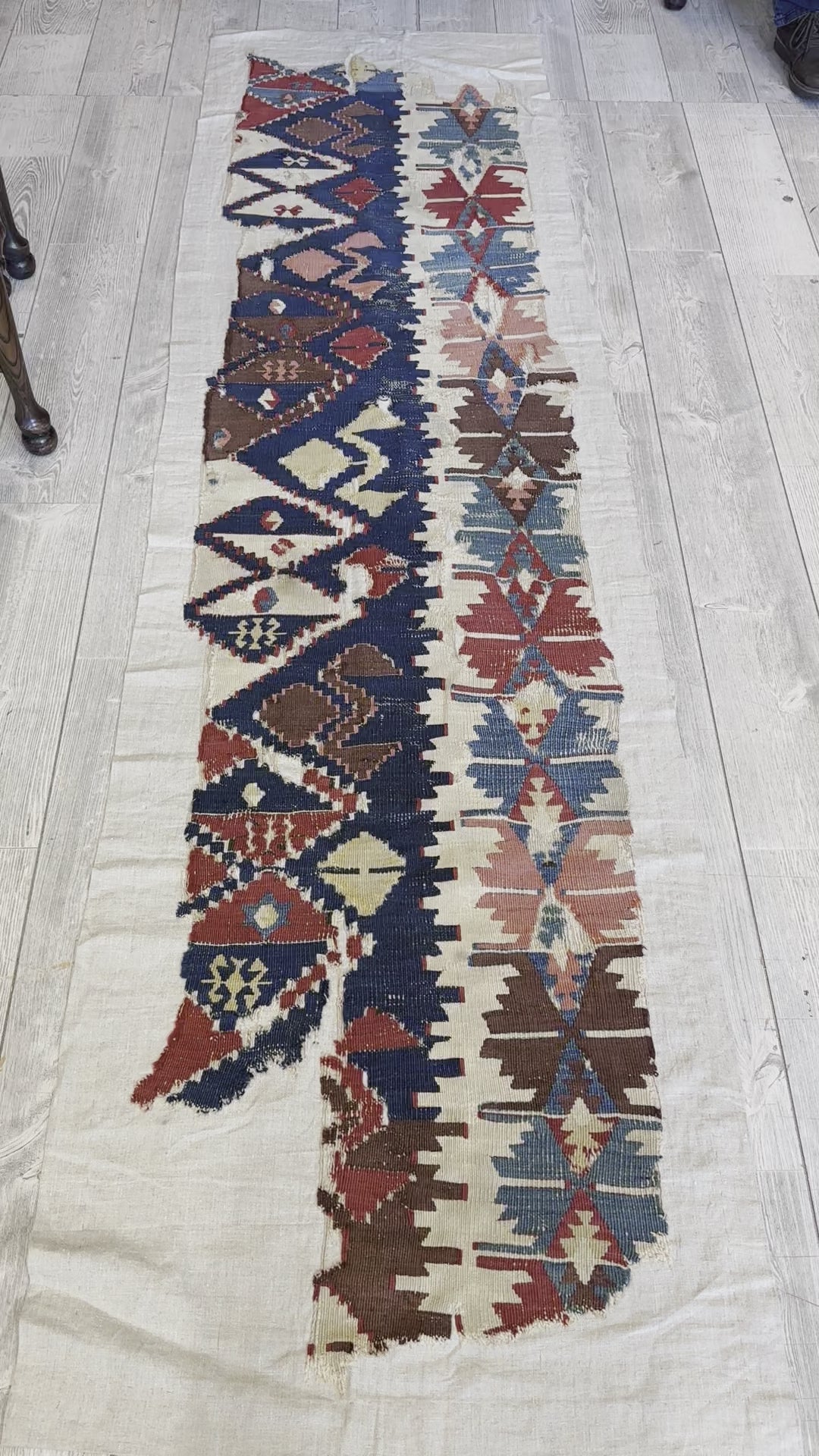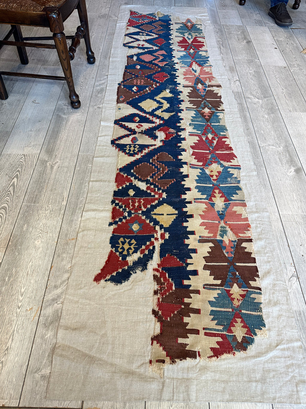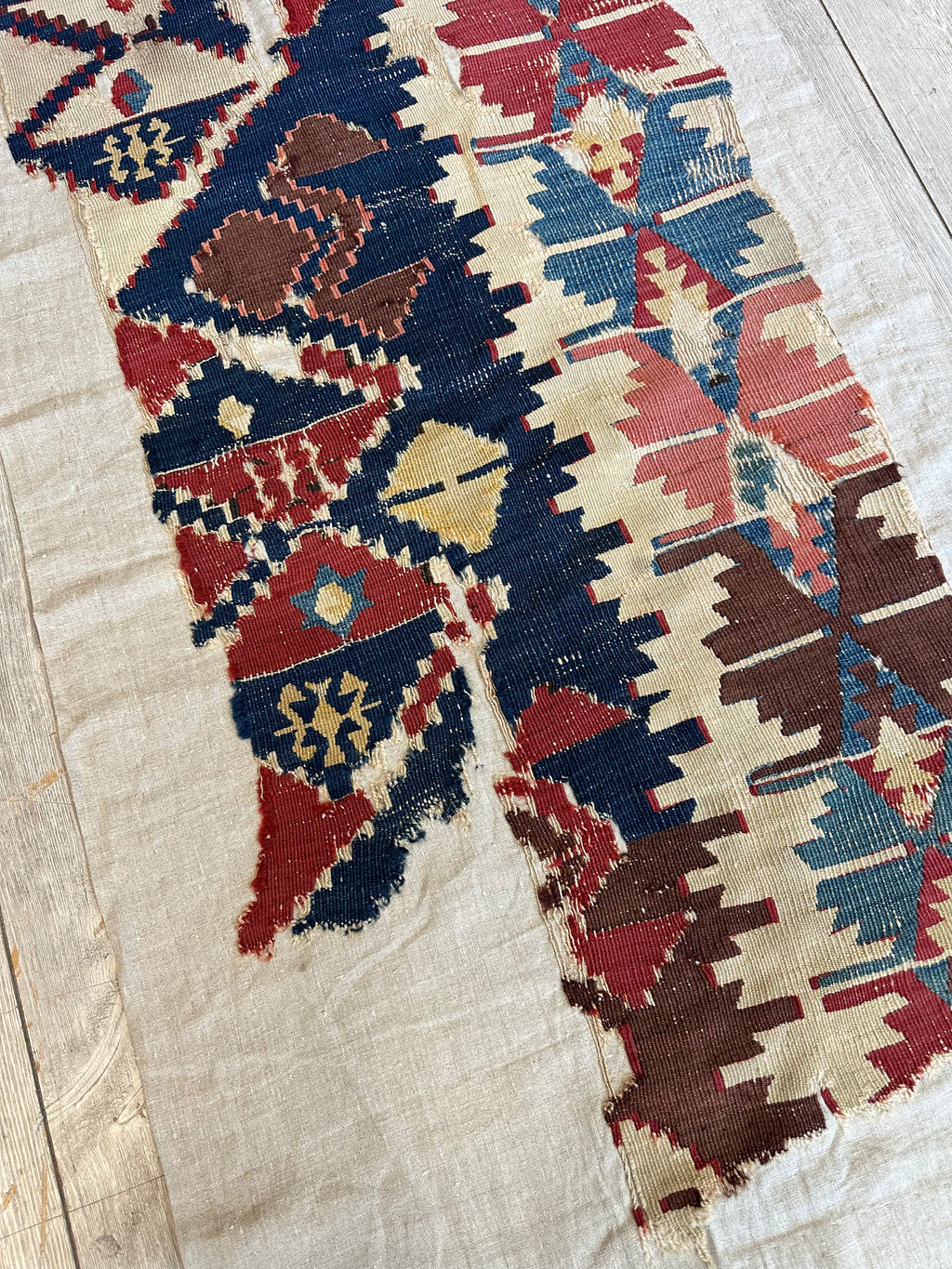 This striking 19th-century Anatolian kilim fragment captures the essence of village weaving traditions from central and western Turkey. The vivid geometry—featuring hooked diamond and stepped medallion motifs—expresses the nomadic artistry of Turkish tribal women who hand-wove each section from naturally dyed, hand-spun wool.