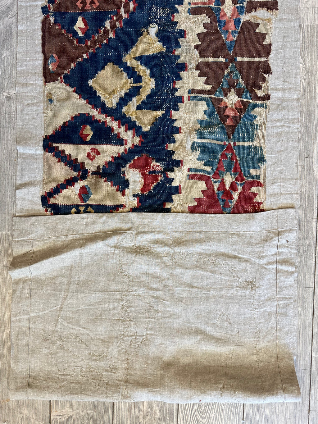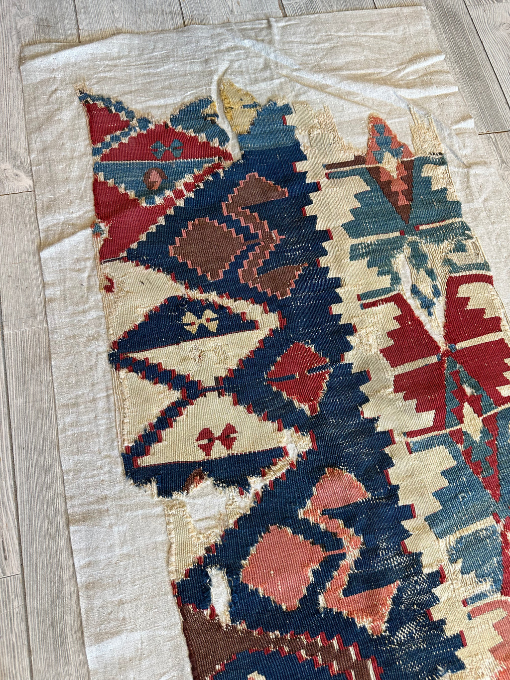 The softened tones of madder red, indigo blue, ivory, and walnut brown reflect over a century of gentle aging. To preserve its delicate structure, the fragment has been professionally hand-sewn onto a cotton textile backing, stabilizing the wool while highlighting its authentic character. Perfect for collectors or as a wall-hung textile artwork, this piece embodies the enduring beauty of Anatolian craftsmanship.