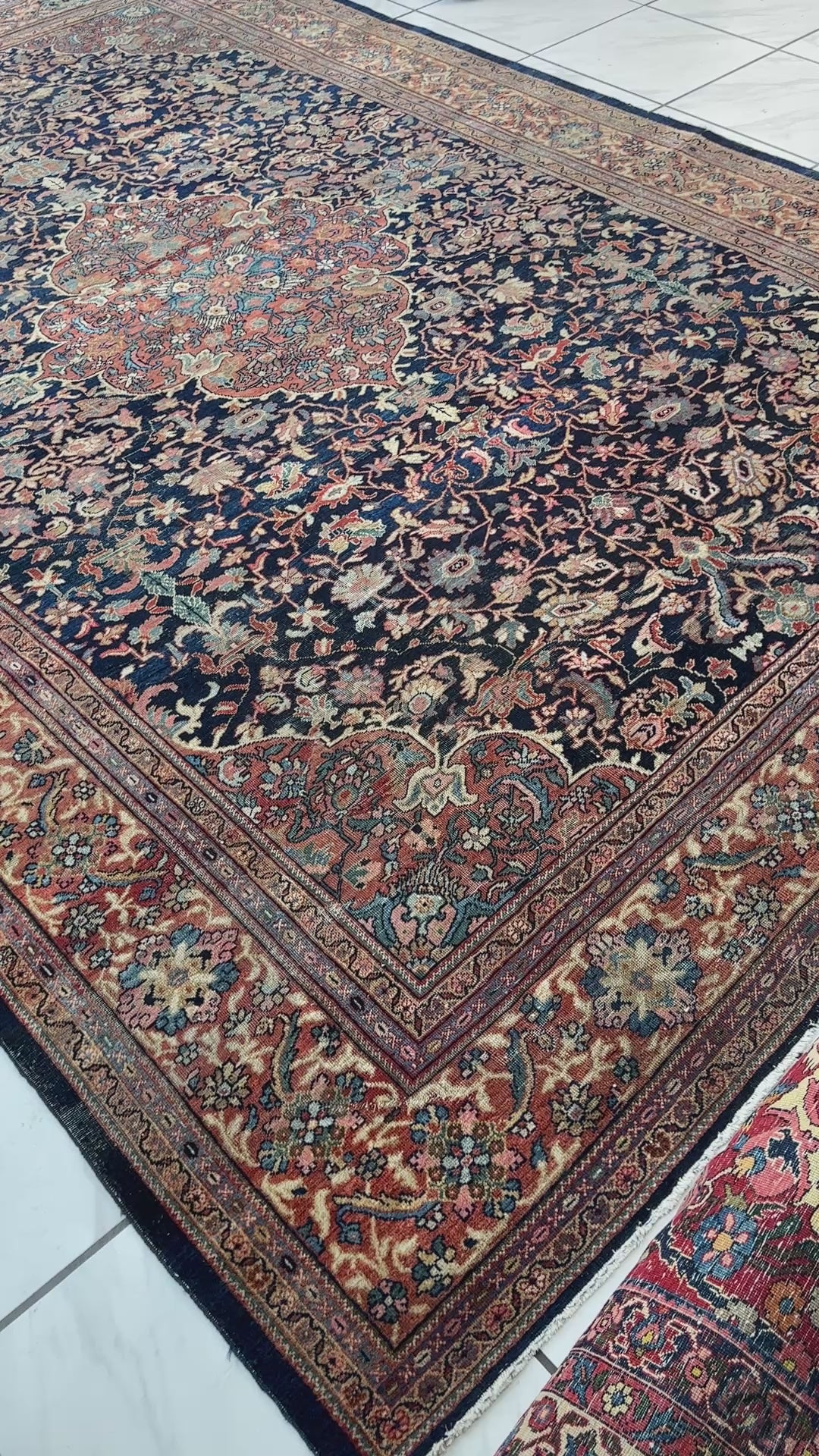 Antique Persian Mahal rug, circa 1900. Mahal means many things in the rug world. The antique Persian carpets from the British firm of Ziegler with large scale all-over patterns in the most desirable soft colors rust, ivory, light blue, light green, are Mahal’s. So are the repeating pattern rugs of the Mahal with red fields and moderate weaves. The rugs termed Sultanabad’s are Mahal’s. With this chameleon character, there is a Mahal for any space, any décor, and any price point. Mahal’s come from the Mahalat area of western Persia. This one is a unique medial design of mahal.