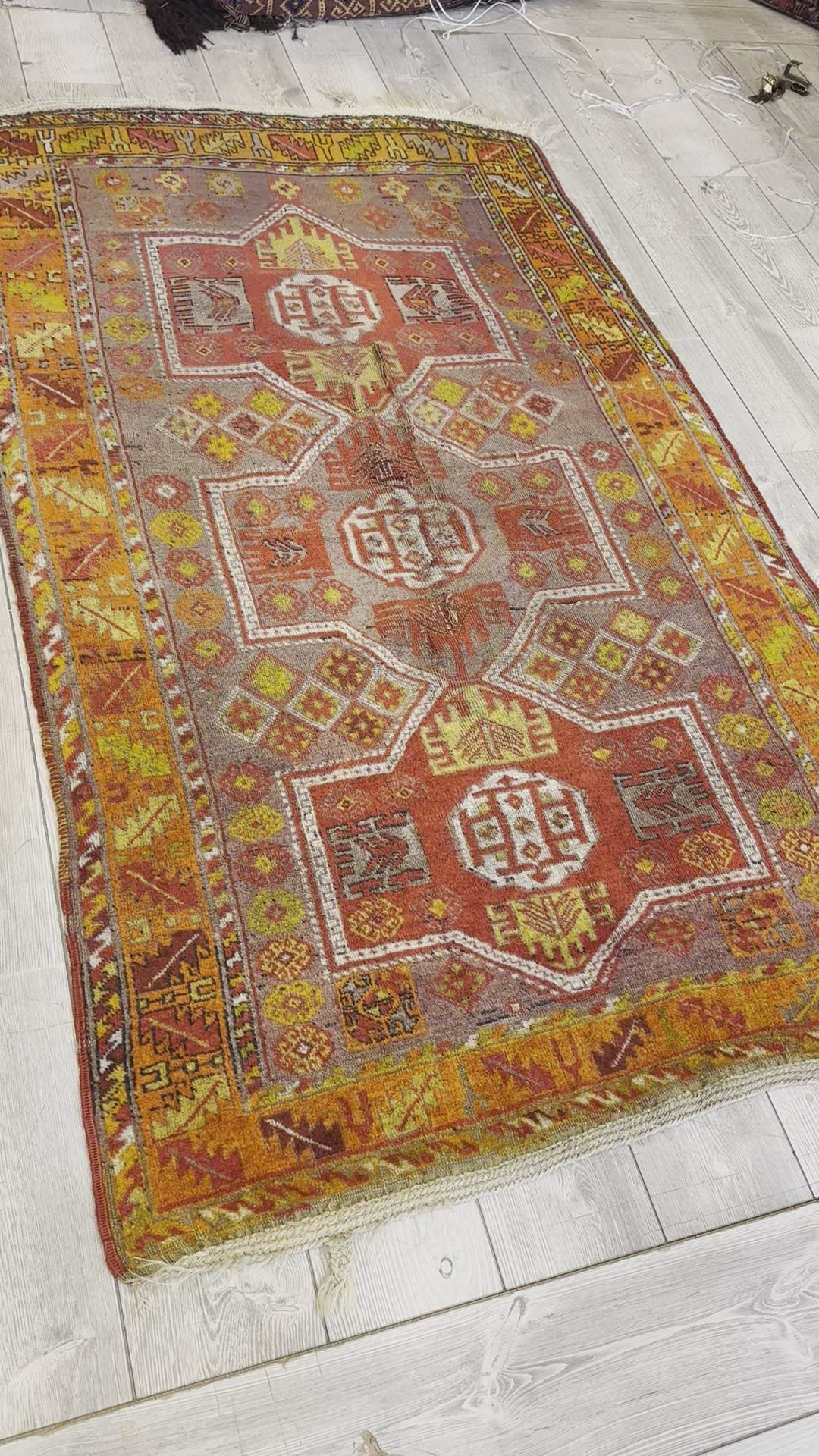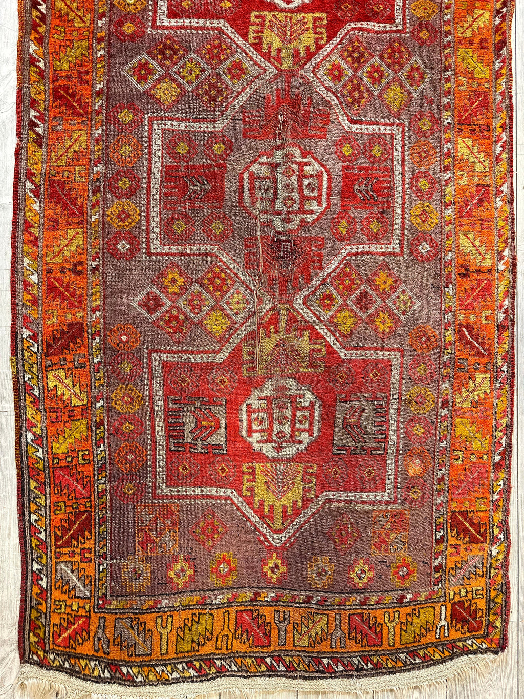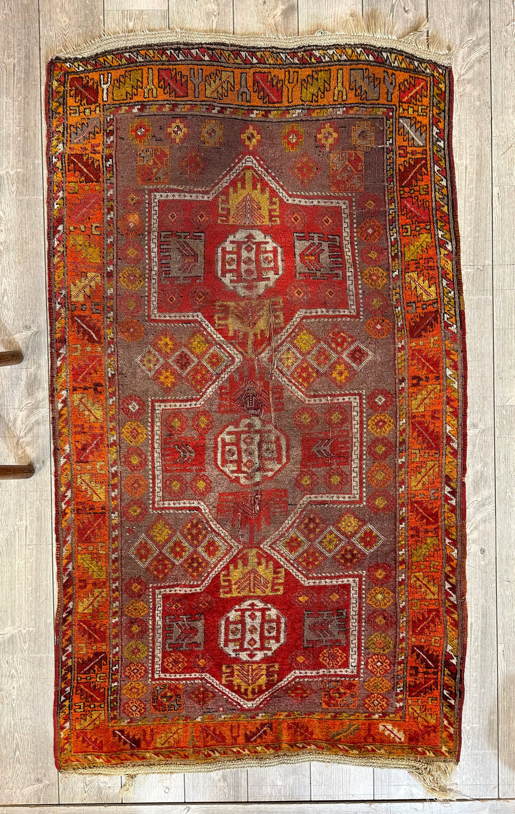 Areas of visible wear and pile loss reveal its authentic age and create a distressed beauty that only genuine antique rugs possess. Woven from hand-spun wool on a wool foundation, the rug remains structurally sound and full of character. It’s ideal for collectors or for interiors seeking a lived-in, timeless charm.
