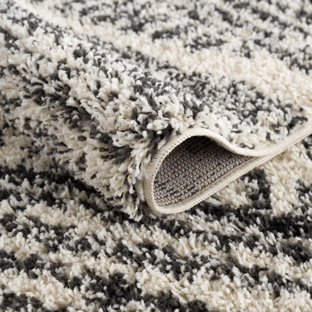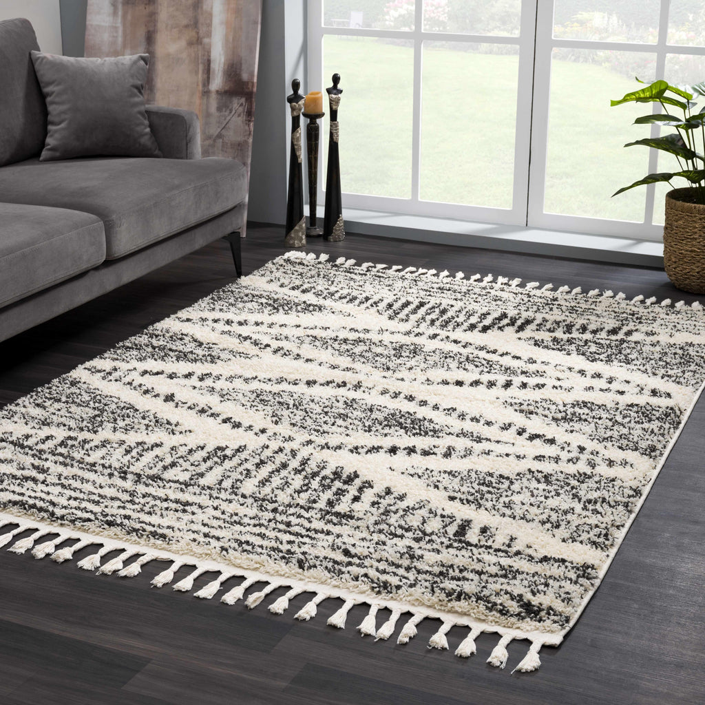 About: This beautiful berber shag rug is perfect for any farmhouse-style living room or bedrooms. It features a fluffy, high pile plush with tassel details and southwestern bohemian tribal style patterns with beige and black colors. It's soft and comfortable underfoot, making it perfect for any space.