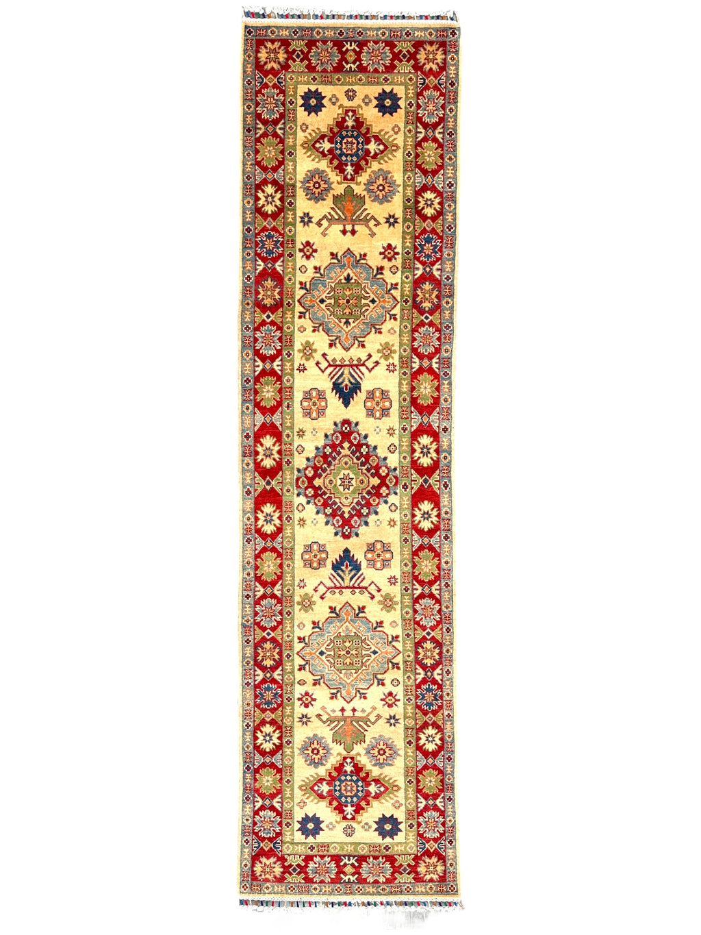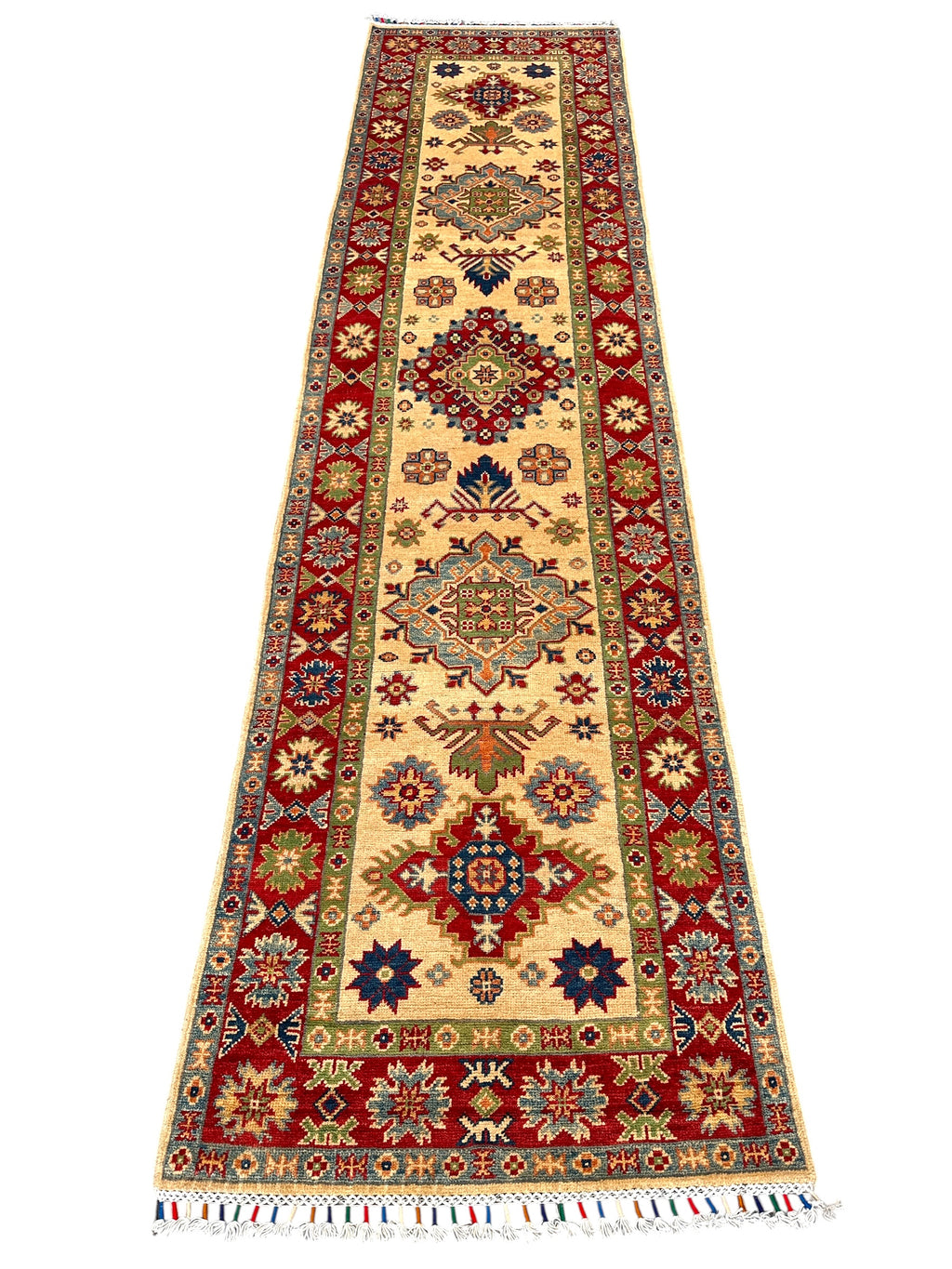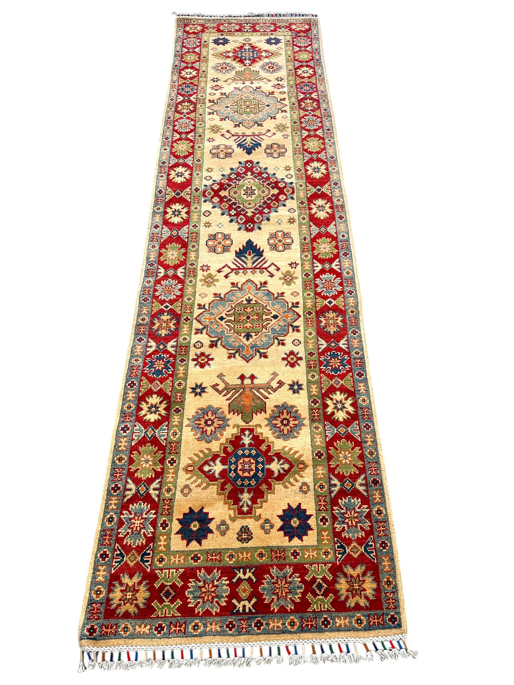 This exquisite hand-knotted Afghan Kazak wool runner is a testament to authentic craftsmanship. Its design features a warm cream field that serves as a vibrant canvas for a series of tribal-inspired geometric motifs in shades of deep red, navy blue, and green. A bold red border with its own intricate geometric pattern frames the runner, creating a striking and cohesive look that will enhance any long space.