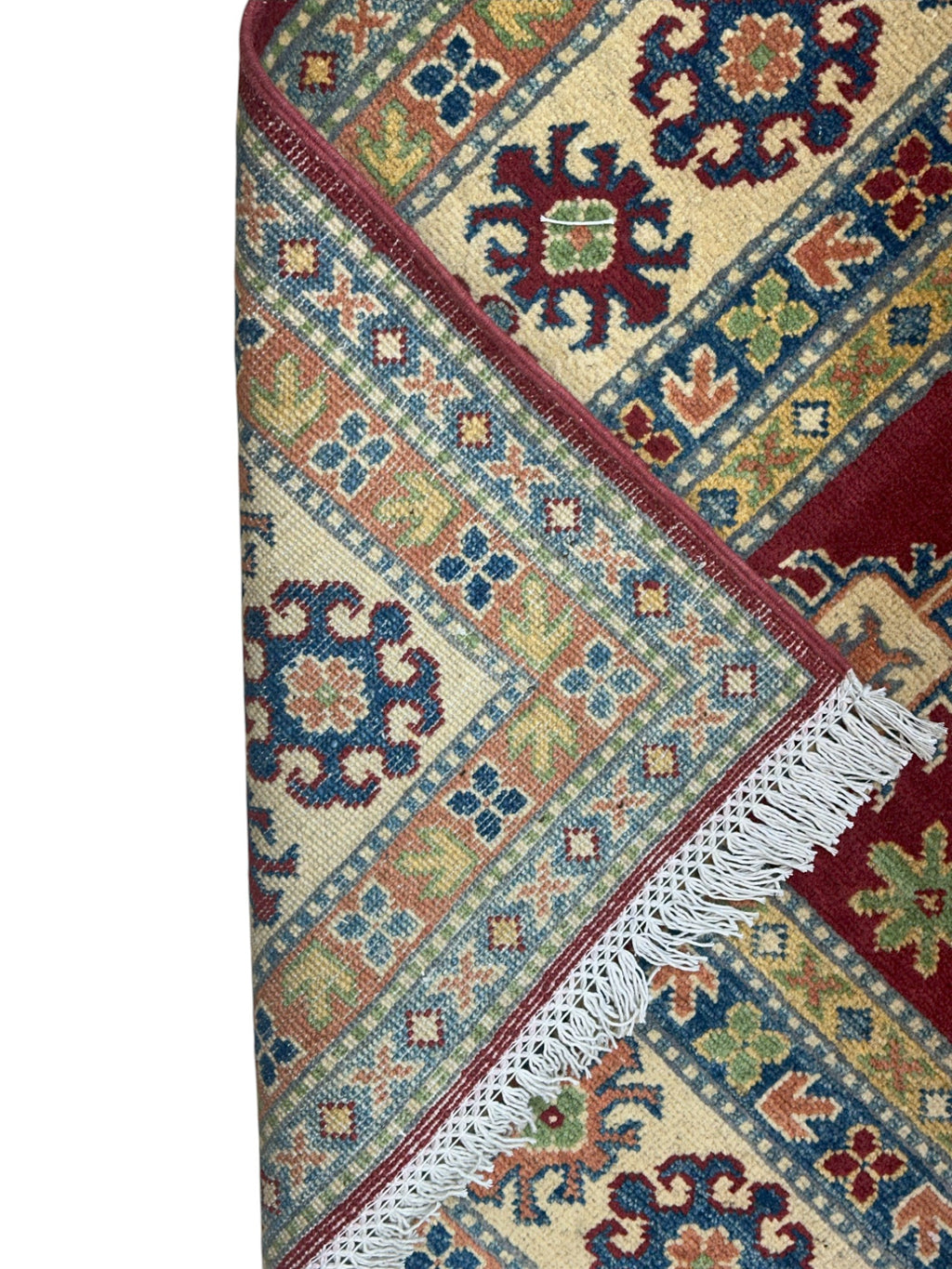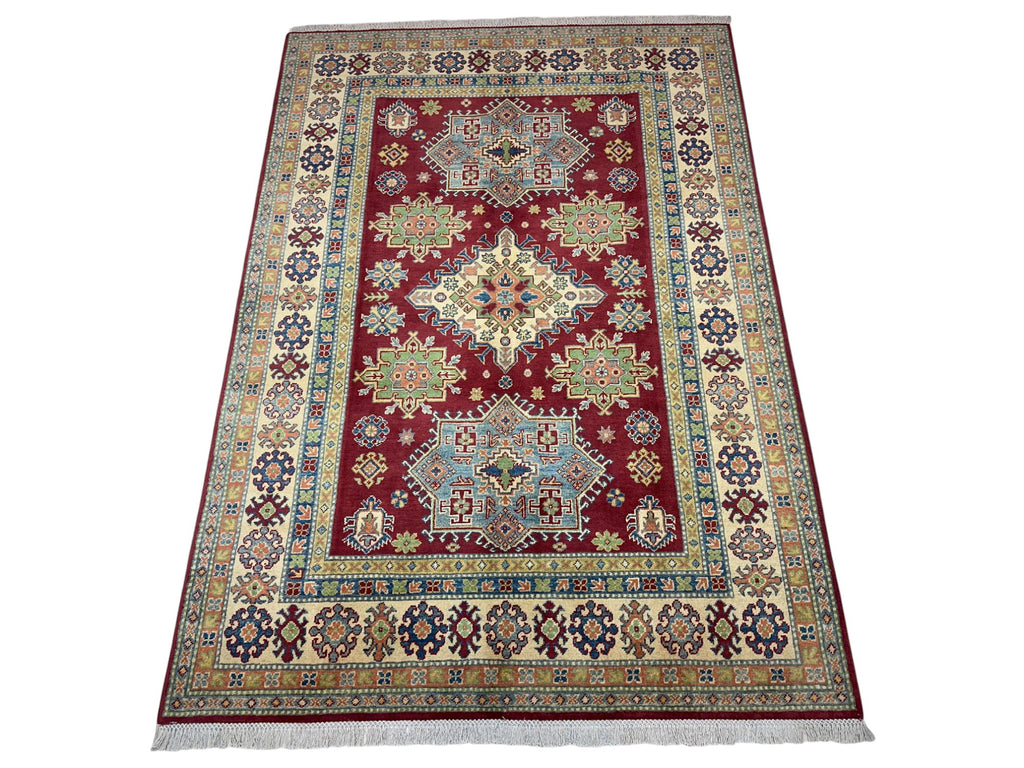 This hand-knotted kazak rug features rich color tones and traditional Afghan weaving. Made with high-quality wool on a cotton foundation, it offers both beauty and durability. Ideal for adding character and texture to entryways, living rooms, or studies.