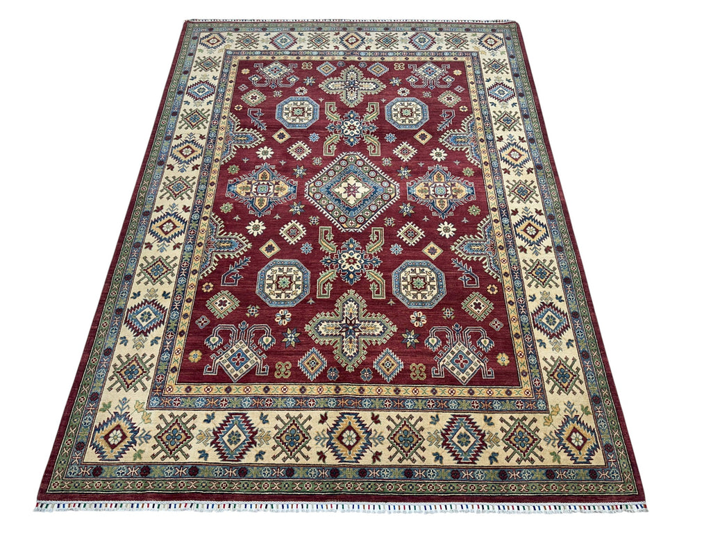 This hand-knotted kazak rug features rich color tones and traditional Afghan weaving. Made with high-quality wool on a cotton foundation, it offers both beauty and durability. Ideal for adding character and texture to entryways, living rooms, or studies.
