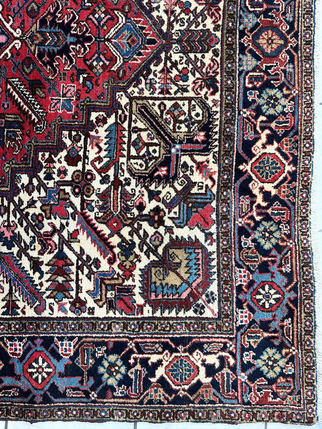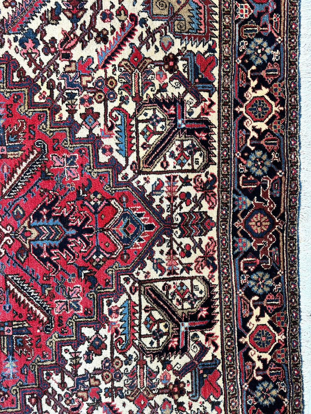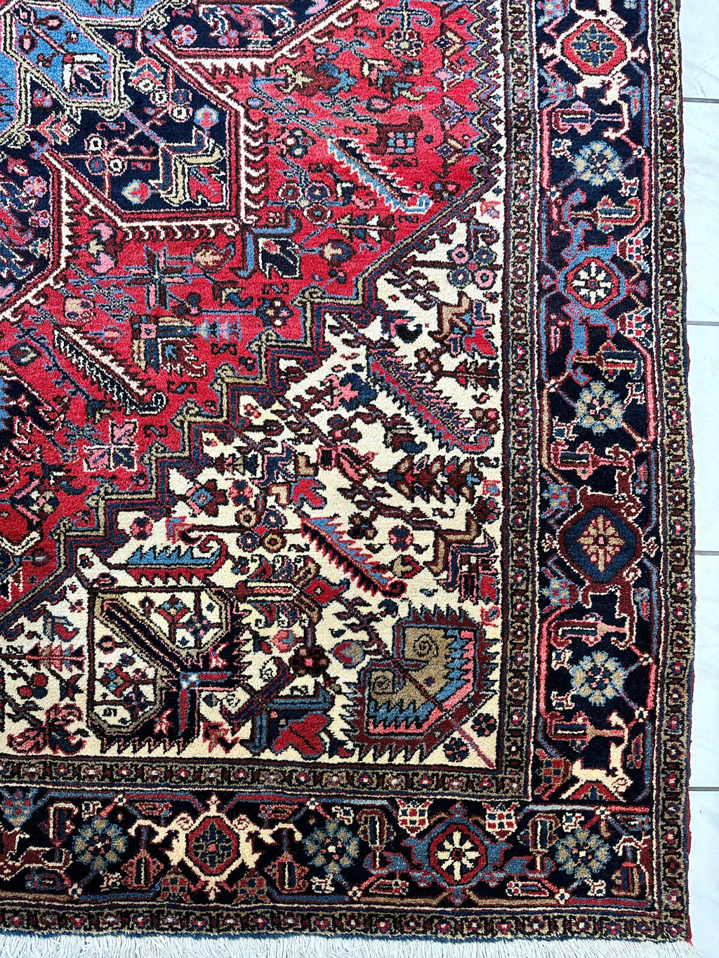 This exquisite hand-knotted Persian Heriz rug showcases a striking geometric medallion design with intricate tribal motifs. The bold red field is framed by an ivory background adorned with angular geometric patterns and a rich navy border, creating a stunning contrast. Woven from high-quality wool, this rug is renowned for its durability and resilience, making it ideal for high-traffic areas such as living rooms, dining spaces, and offices.