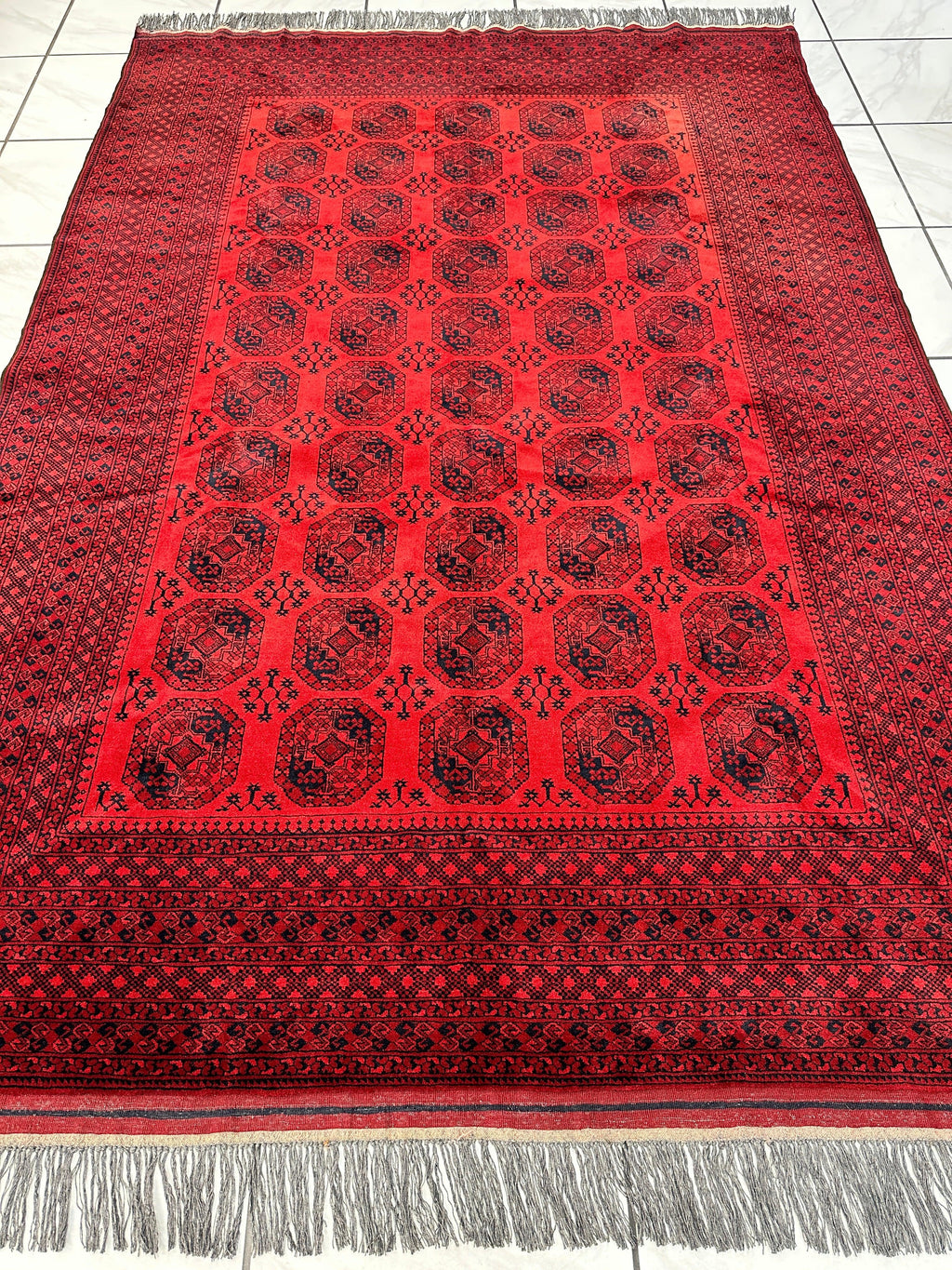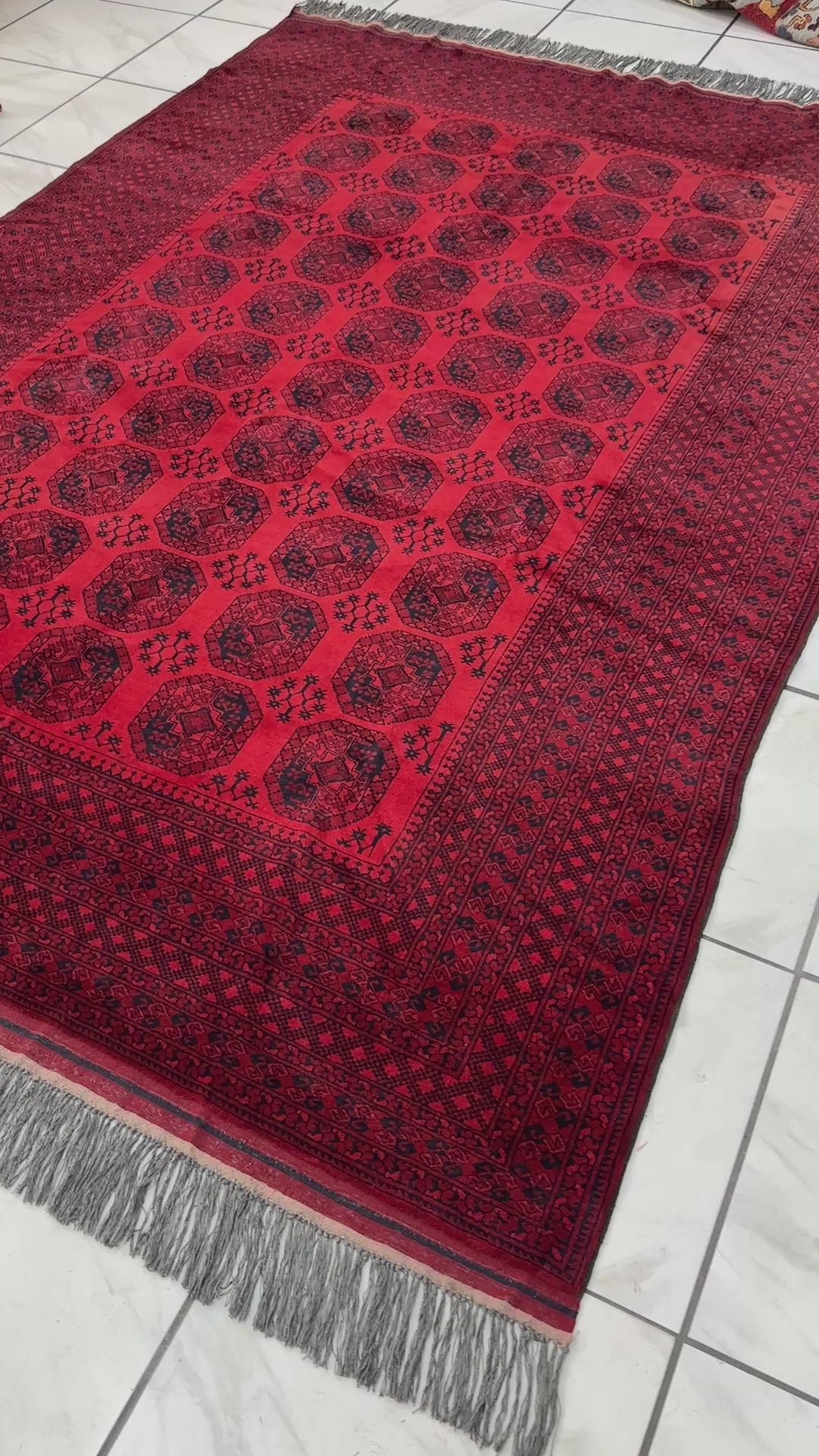 This exquisite hand-knotted Turkemen Ersari rug showcases a striking geometric pattern in deep red tones, a signature characteristic of traditional Ersari craftsmanship. The central field is adorned with repeating guls, each intricately woven to reflect the rich heritage of Afghan rug-making. The finely detailed borders frame the design, adding depth and elegance. Made from high-quality wool, this rug is both durable and soft underfoot, making it a perfect addition to living rooms, dining areas, or offices. Its timeless appeal and vibrant color palette bring warmth and sophistication to any space.
