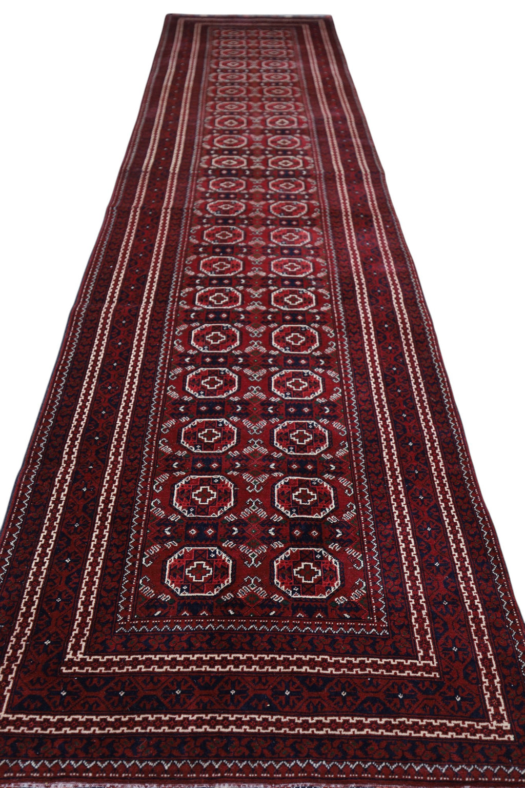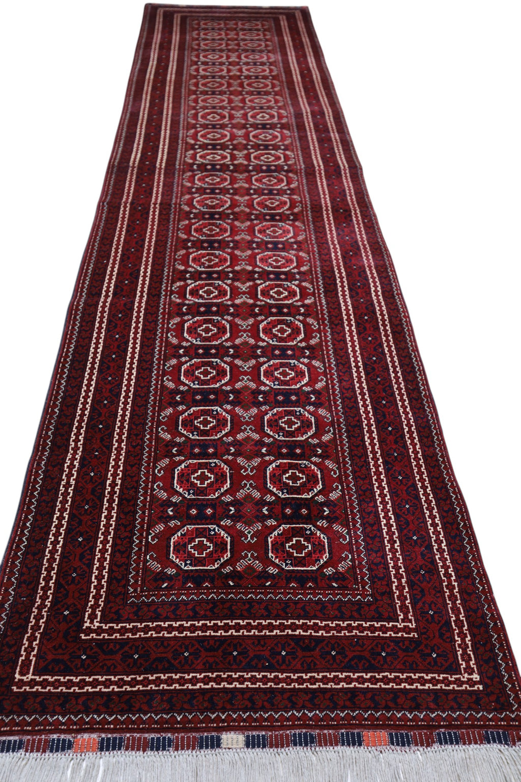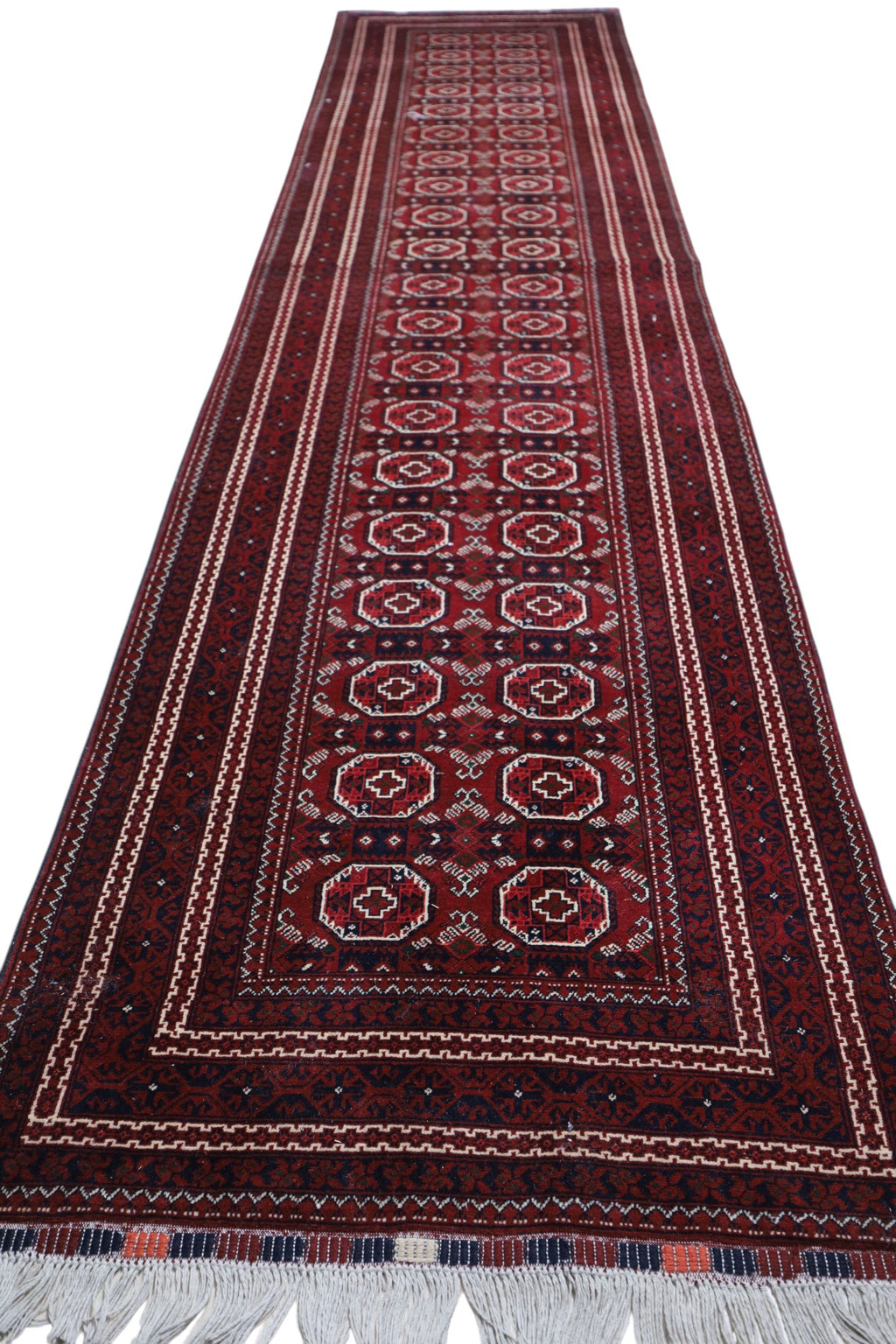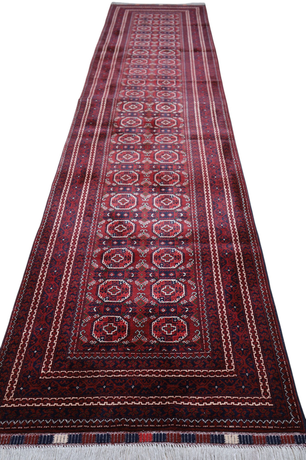 This hand-knotted waziri rug features rich color tones and traditional Afghan weaving. Made with high-quality wool on a cotton foundation, it offers both beauty and durability. Ideal for adding character and texture to entryways, living rooms, or studies.