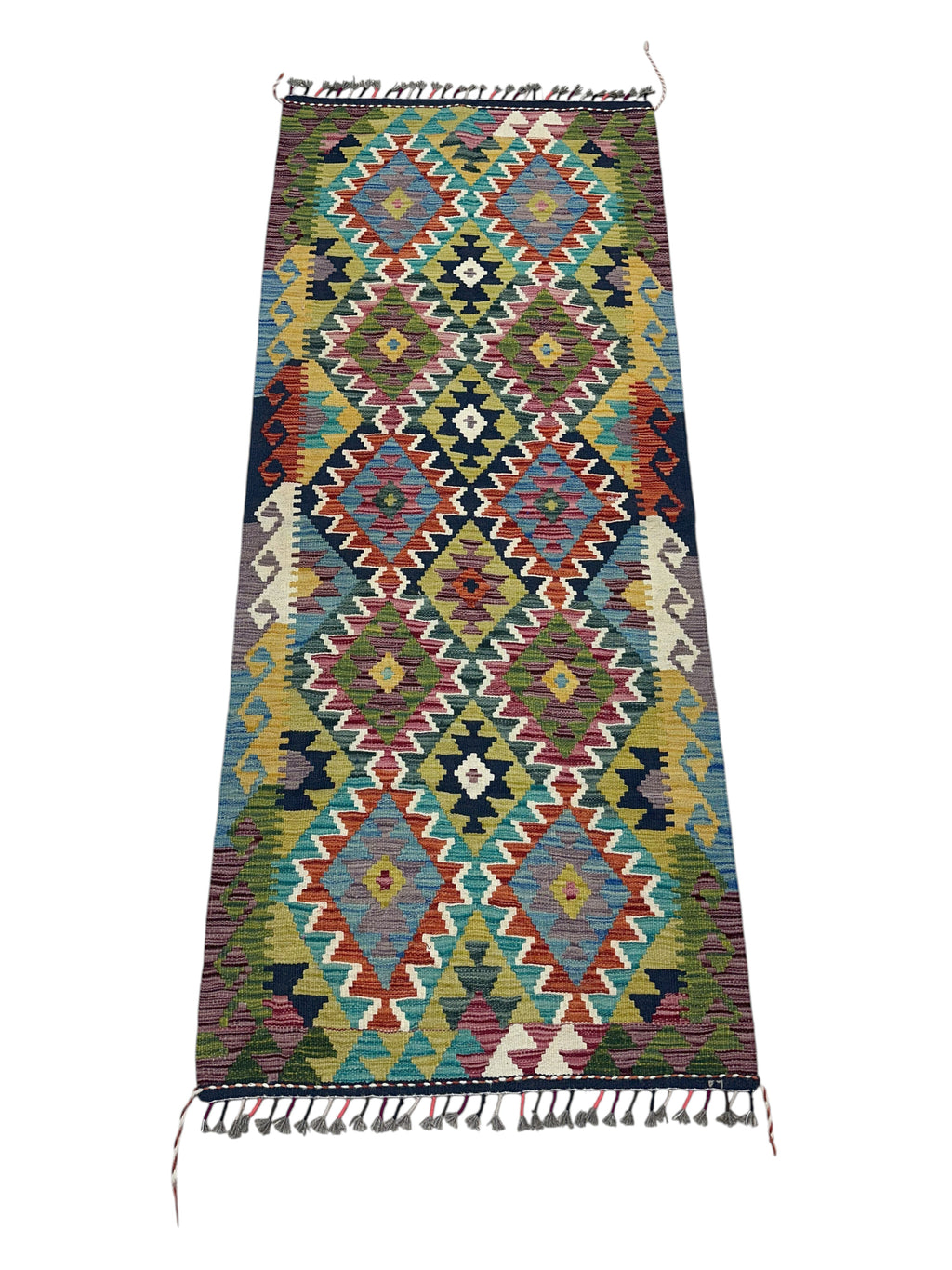 This newly made, hand-woven Kilim rug was hand-selected in Afghanistan to ensure the highest quality and authenticity. Each piece embodies generations of traditional flatweave craftsmanship. Lightweight and reversible, it is ideal for layering or use in high-traffic areas such as entryways, living rooms, or offices.