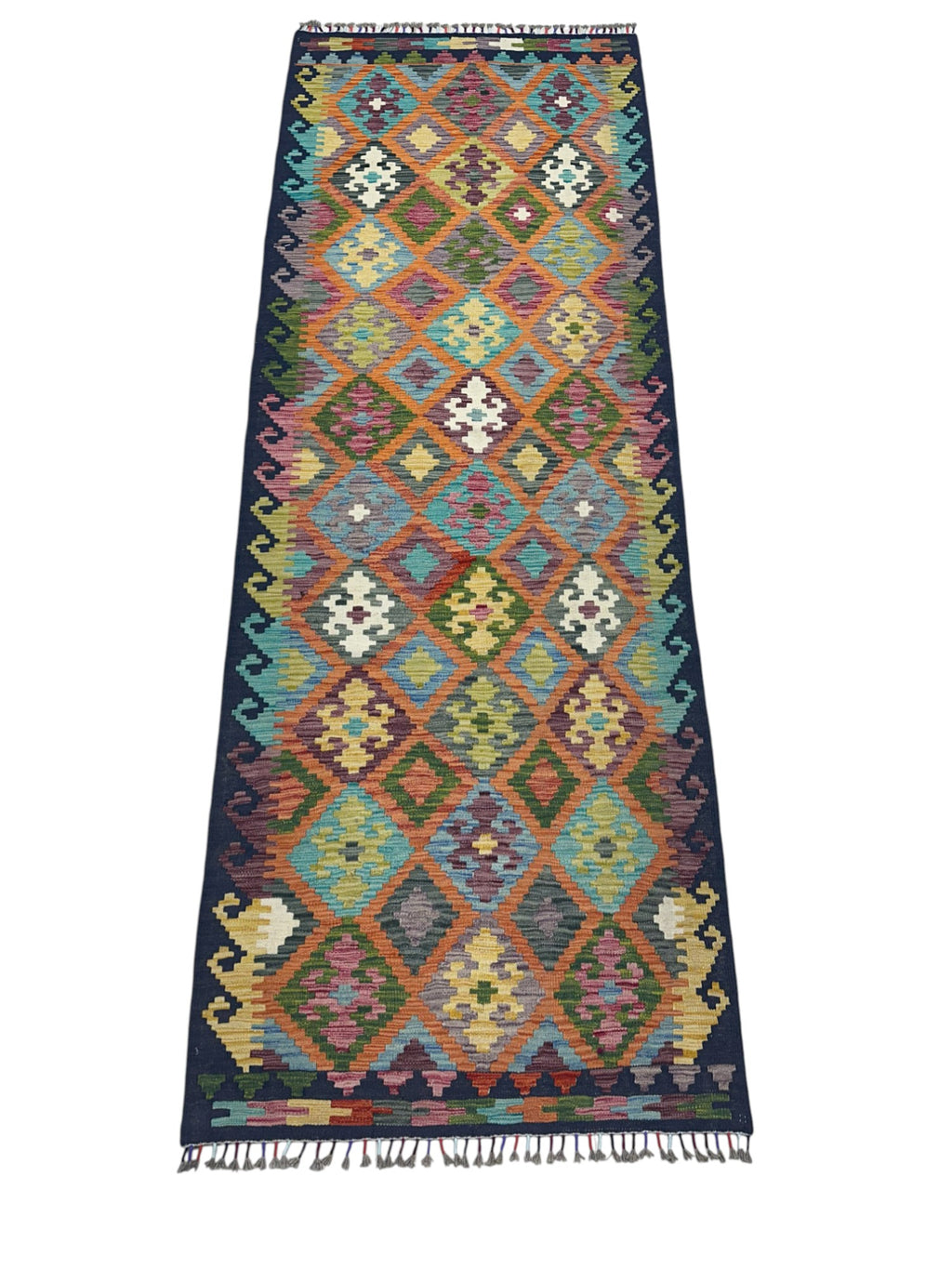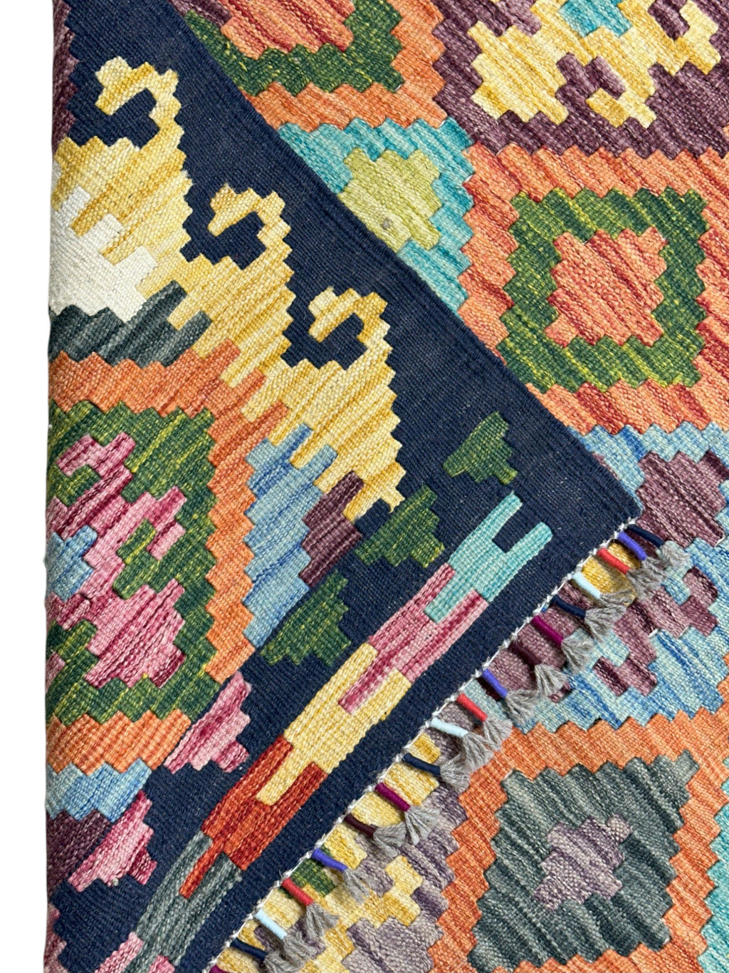 This newly made, hand-woven Kilim rug was hand-selected in Afghanistan to ensure the highest quality and authenticity. Each piece embodies generations of traditional flatweave craftsmanship. Lightweight and reversible, it is ideal for layering or use in high-traffic areas such as entryways, living rooms, or offices.