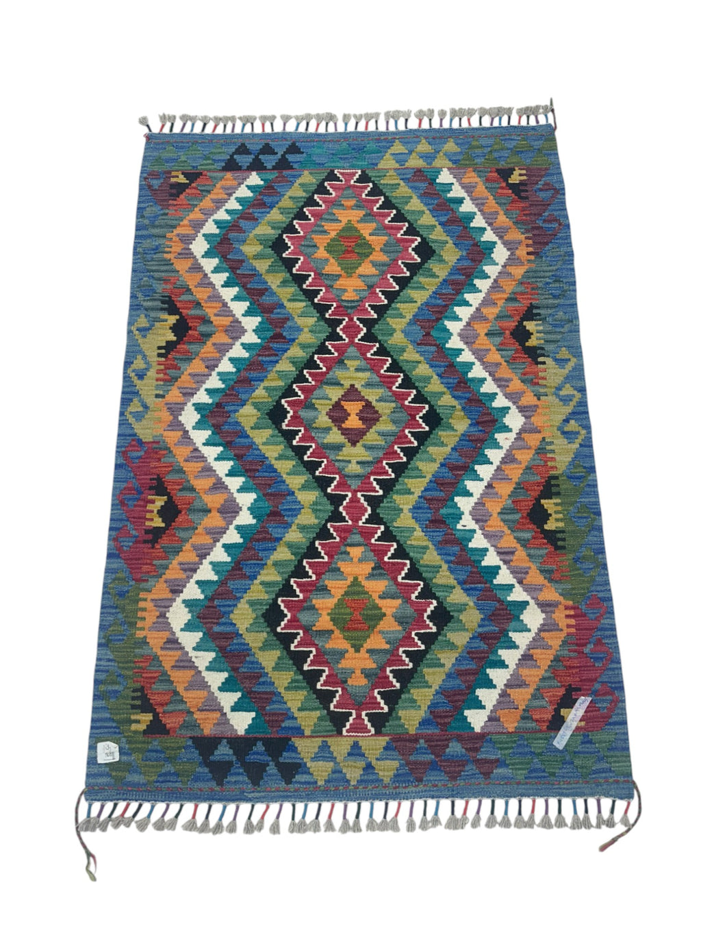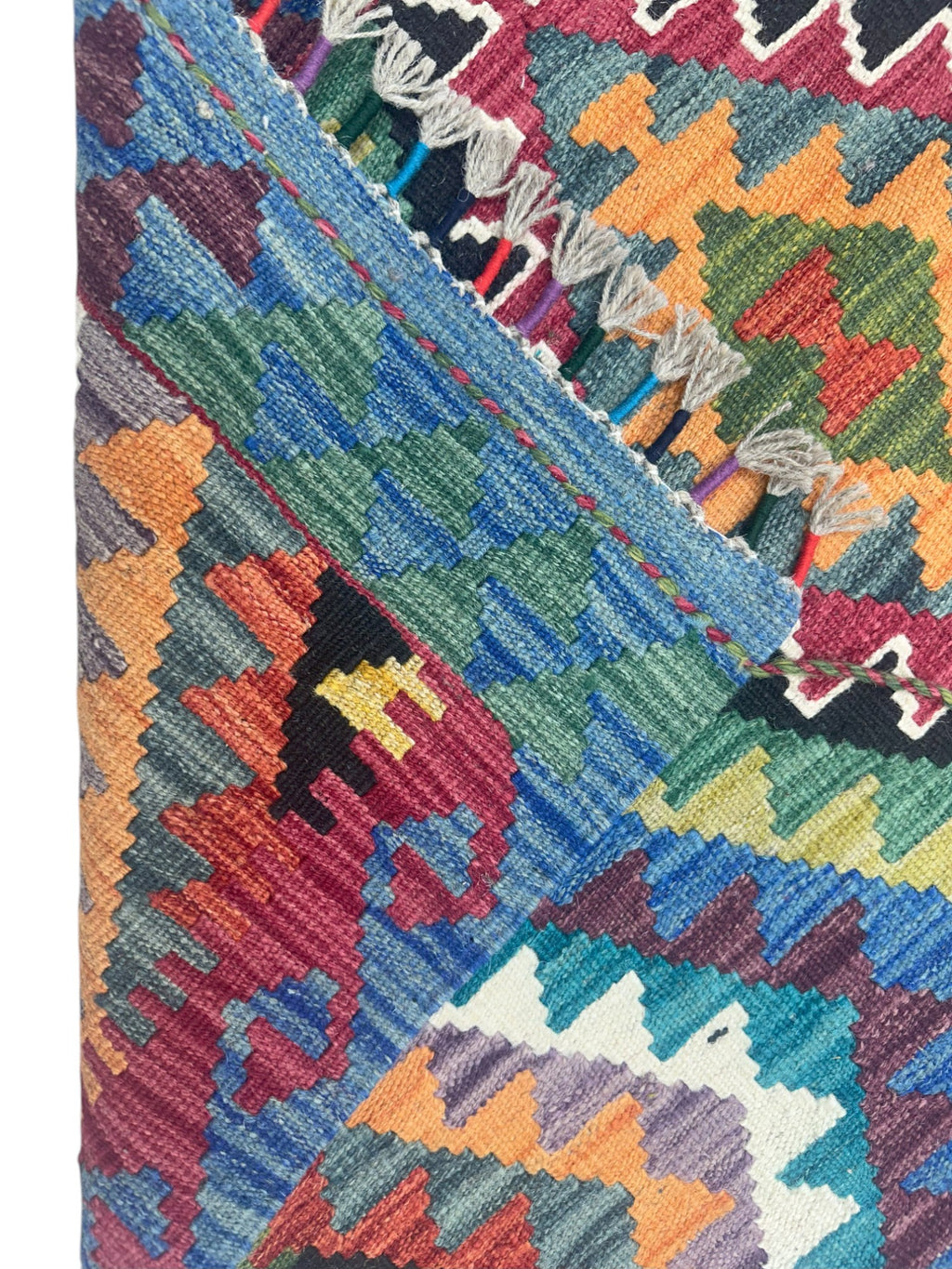 This newly made, hand-woven Kilim rug was hand-selected in Afghanistan to ensure the highest quality and authenticity. Each piece embodies generations of traditional flatweave craftsmanship. Lightweight and reversible, it is ideal for layering or use in high-traffic areas such as entryways, living rooms, or offices.