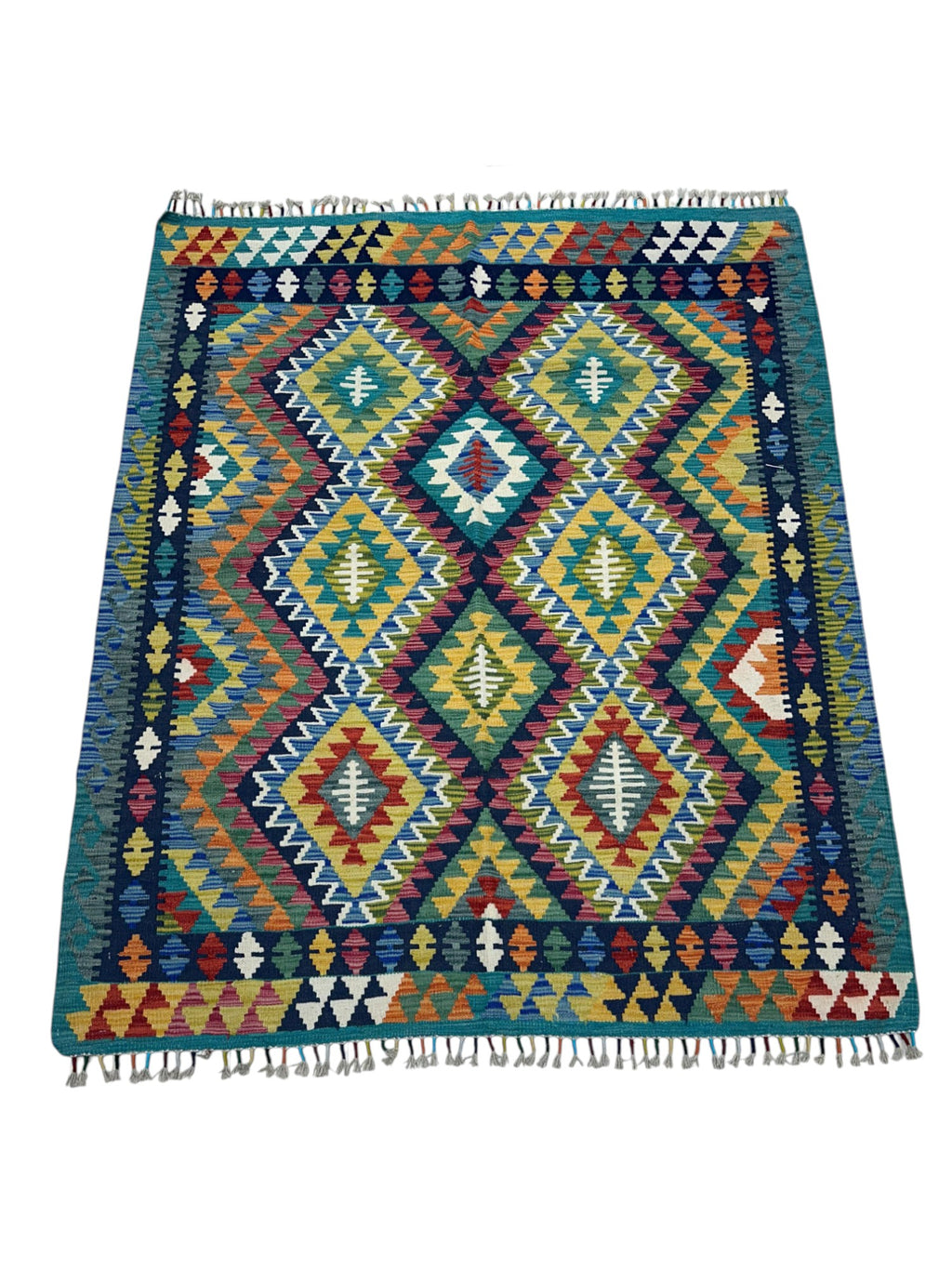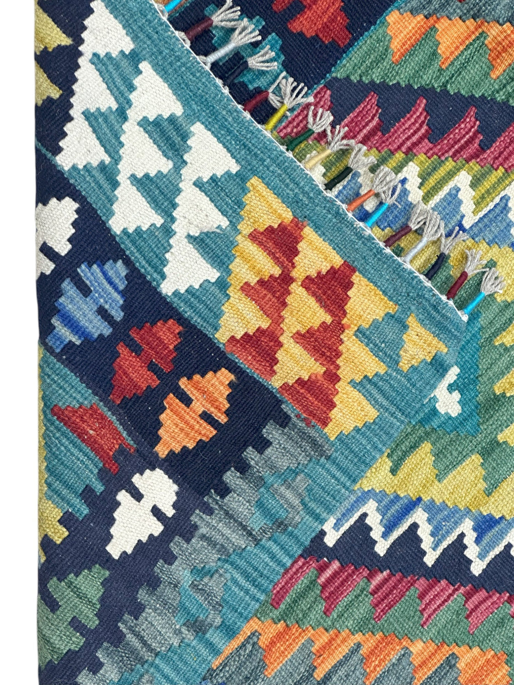 This newly made, hand-woven Kilim rug was hand-selected in Afghanistan to ensure the highest quality and authenticity. Each piece embodies generations of traditional flatweave craftsmanship. Lightweight and reversible, it is ideal for layering or use in high-traffic areas such as entryways, living rooms, or offices.