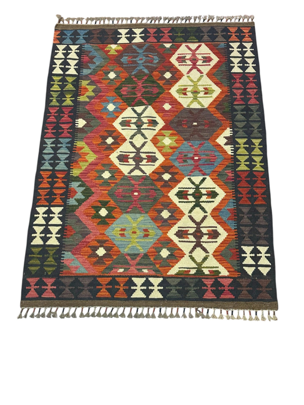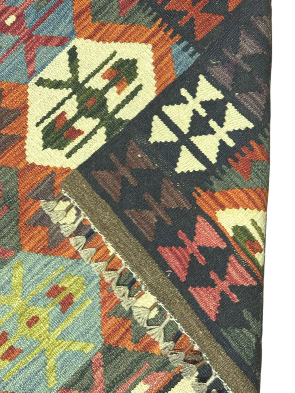 This newly made, hand-woven Kilim rug was hand-selected in Afghanistan to ensure the highest quality and authenticity. Each piece embodies generations of traditional flatweave craftsmanship. Lightweight and reversible, it is ideal for layering or use in high-traffic areas such as entryways, living rooms, or offices.