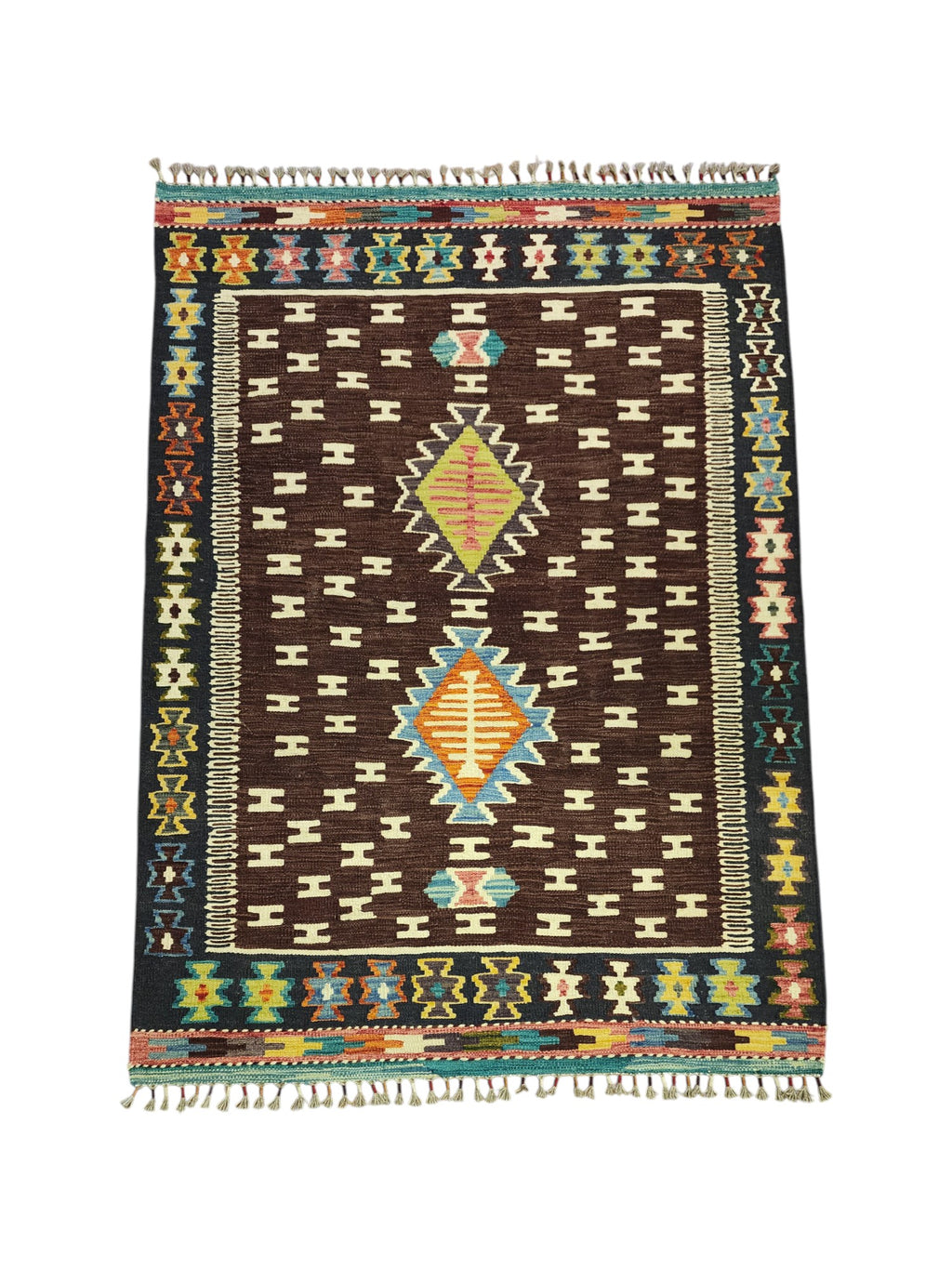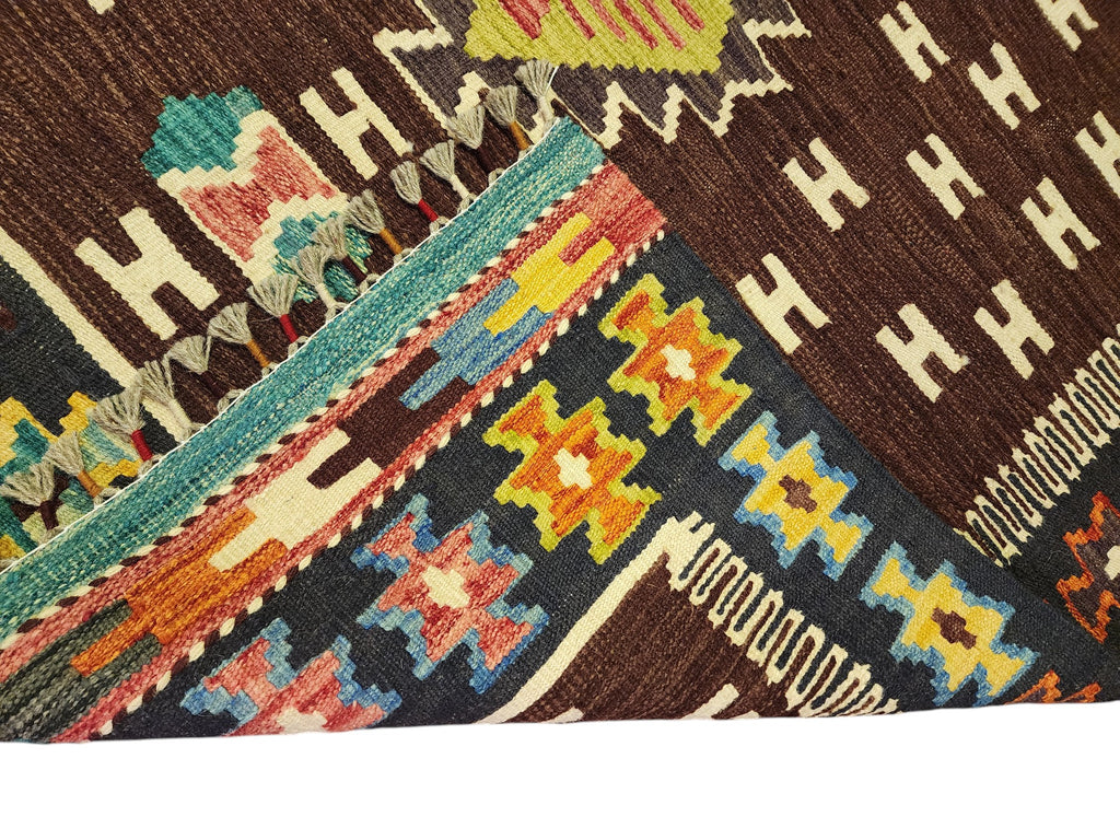 This newly made, hand-woven Kilim rug was hand-selected in Afghanistan to ensure the highest quality and authenticity. Each piece embodies generations of traditional flatweave craftsmanship. Lightweight and reversible, it is ideal for layering or use in high-traffic areas such as entryways, living rooms, or offices.