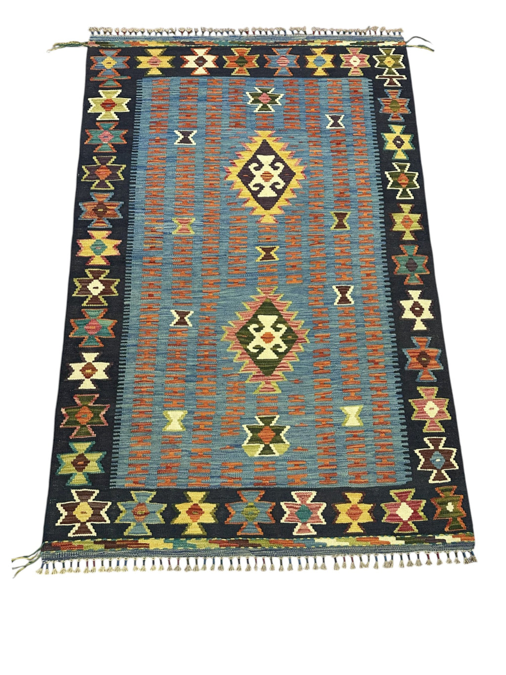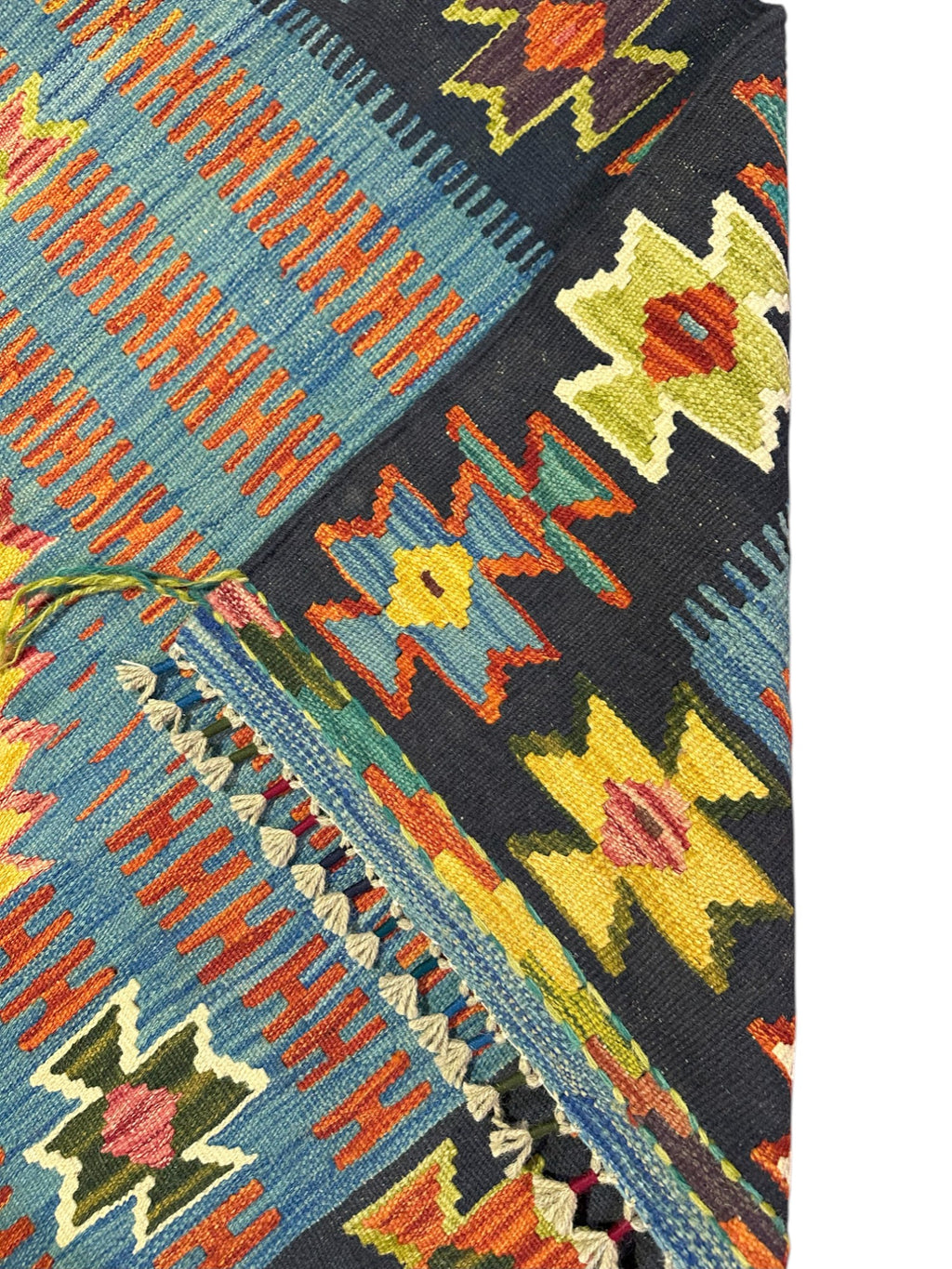 This newly made, hand-woven Kilim rug was hand-selected in Afghanistan to ensure the highest quality and authenticity. Each piece embodies generations of traditional flatweave craftsmanship. Lightweight and reversible, it is ideal for layering or use in high-traffic areas such as entryways, living rooms, or offices.