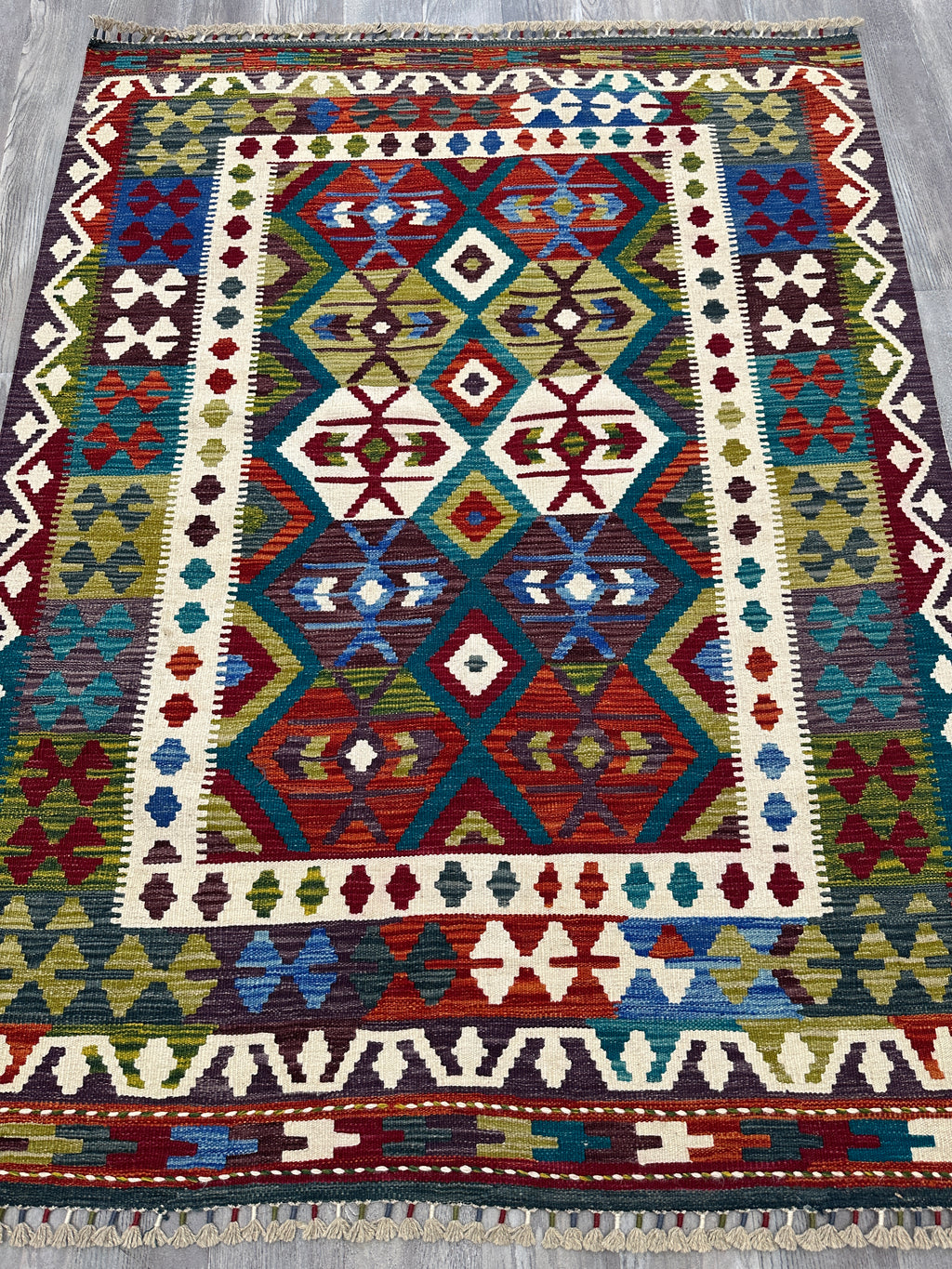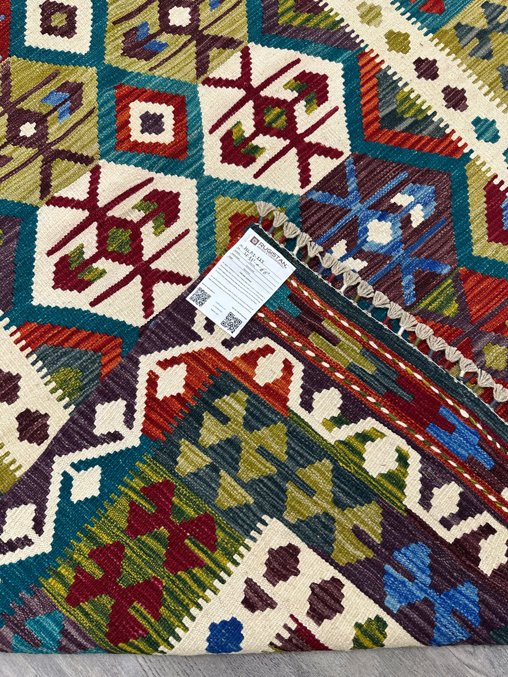 This newly made, hand-woven Kilim rug was hand-selected in Afghanistan to ensure the highest quality and authenticity. Each piece embodies generations of traditional flatweave craftsmanship. Lightweight and reversible, it is ideal for layering or use in high-traffic areas such as entryways, living rooms, or offices.