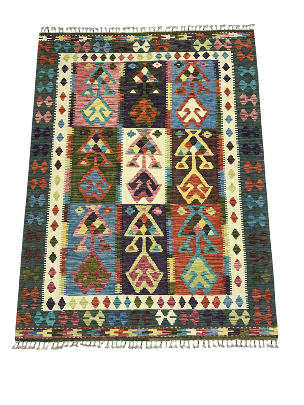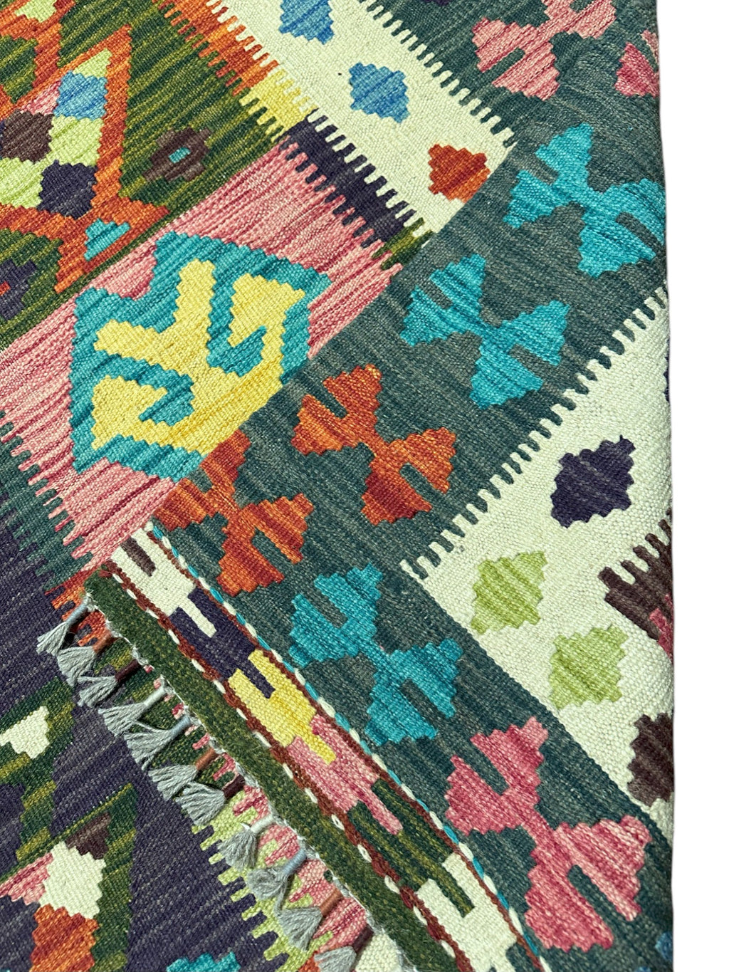 This newly made, hand-woven Kilim rug was hand-selected in Afghanistan to ensure the highest quality and authenticity. Each piece embodies generations of traditional flatweave craftsmanship. Lightweight and reversible, it is ideal for layering or use in high-traffic areas such as entryways, living rooms, or offices.