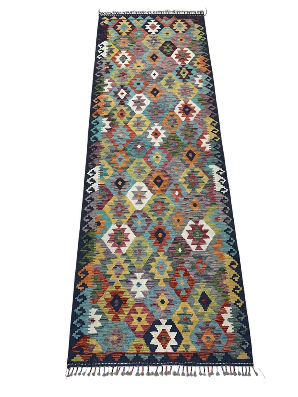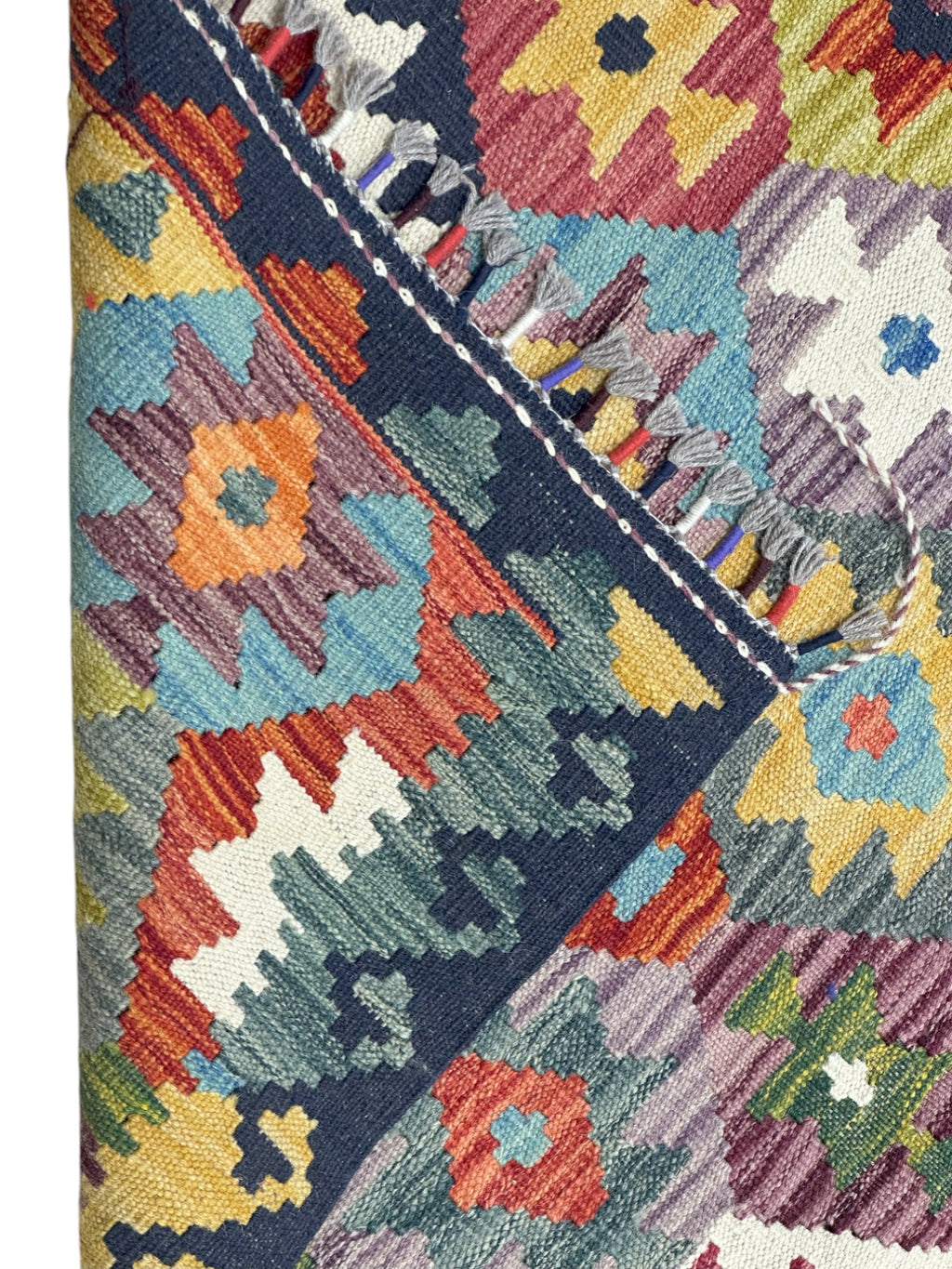 This newly made, hand-woven Kilim rug was hand-selected in Afghanistan to ensure the highest quality and authenticity. Each piece embodies generations of traditional flatweave craftsmanship. Lightweight and reversible, it is ideal for layering or use in high-traffic areas such as entryways, living rooms, or offices.