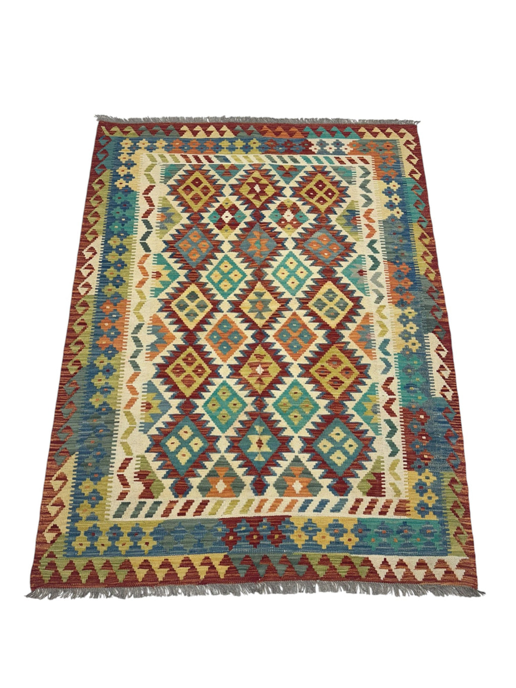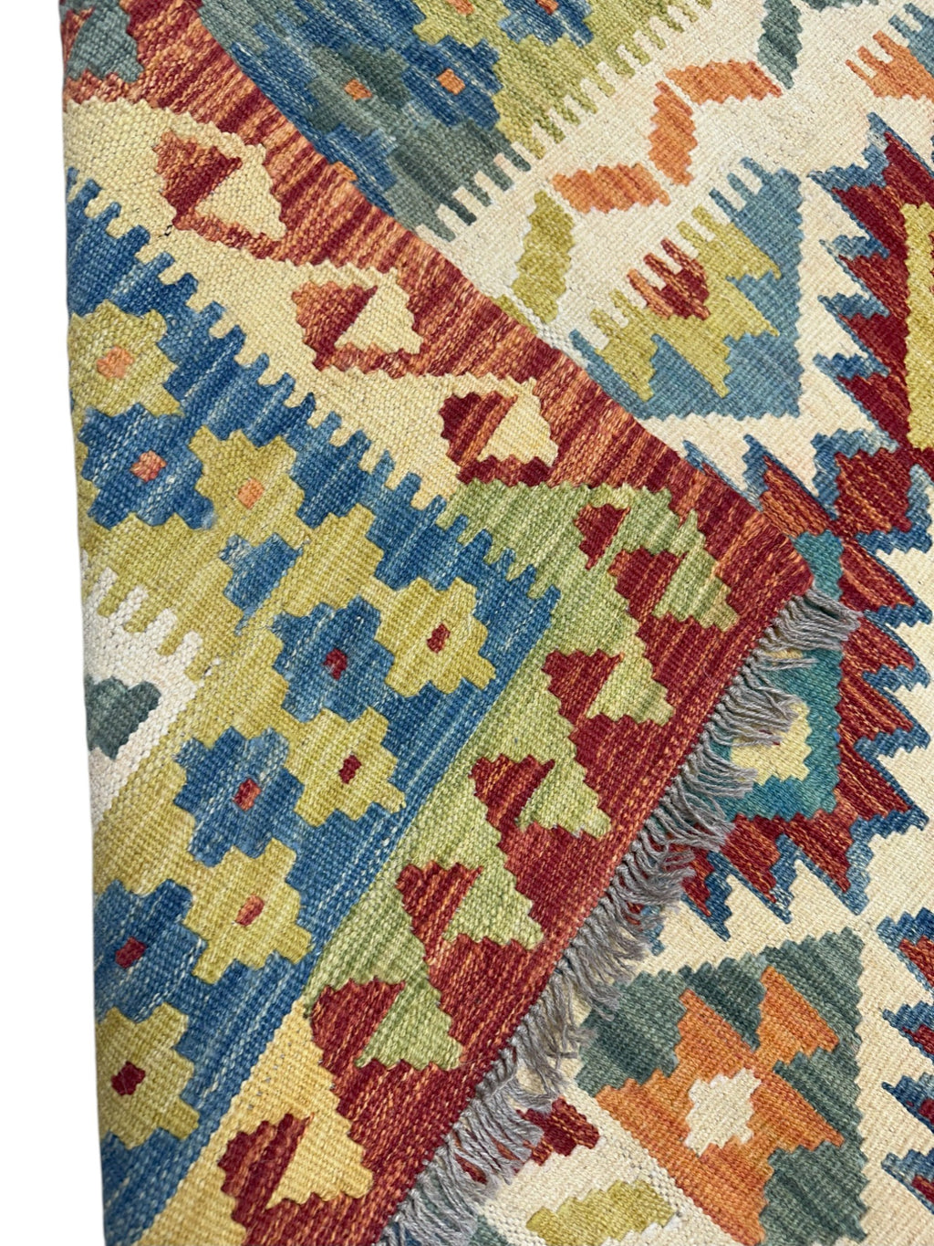 This newly made, hand-woven Kilim rug was hand-selected in Afghanistan to ensure the highest quality and authenticity. Each piece embodies generations of traditional flatweave craftsmanship. Lightweight and reversible, it is ideal for layering or use in high-traffic areas such as entryways, living rooms, or offices.