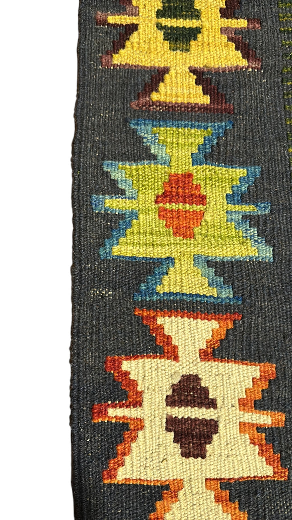 This newly made, hand-woven Kilim rug was hand-selected in Afghanistan to ensure the highest quality and authenticity. Each piece embodies generations of traditional flatweave craftsmanship. Lightweight and reversible, it is ideal for layering or use in high-traffic areas such as entryways, living rooms, or offices.