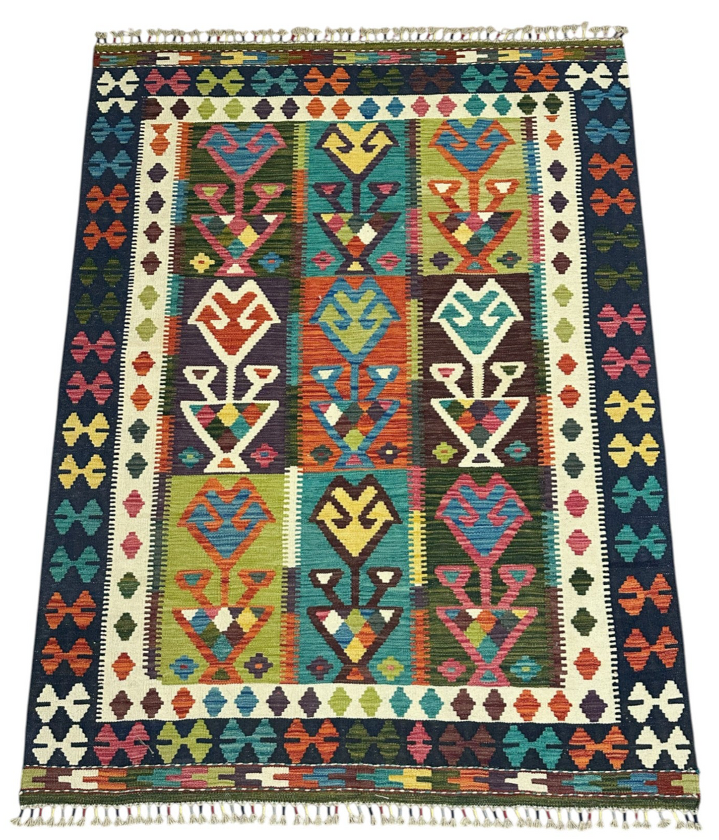 This newly made, hand-woven Kilim rug was hand-selected in Afghanistan to ensure the highest quality and authenticity. Each piece embodies generations of traditional flatweave craftsmanship. Lightweight and reversible, it is ideal for layering or use in high-traffic areas such as entryways, living rooms, or offices.