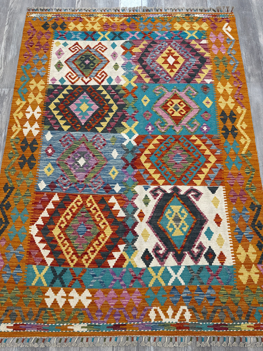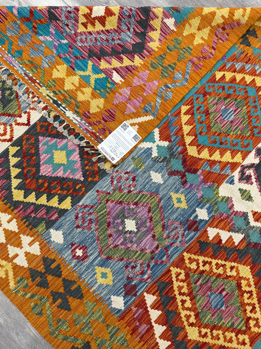 This newly made, hand-woven Kilim rug was hand-selected in Afghanistan to ensure the highest quality and authenticity. Each piece embodies generations of traditional flatweave craftsmanship. Lightweight and reversible, it is ideal for layering or use in high-traffic areas such as entryways, living rooms, or offices.
