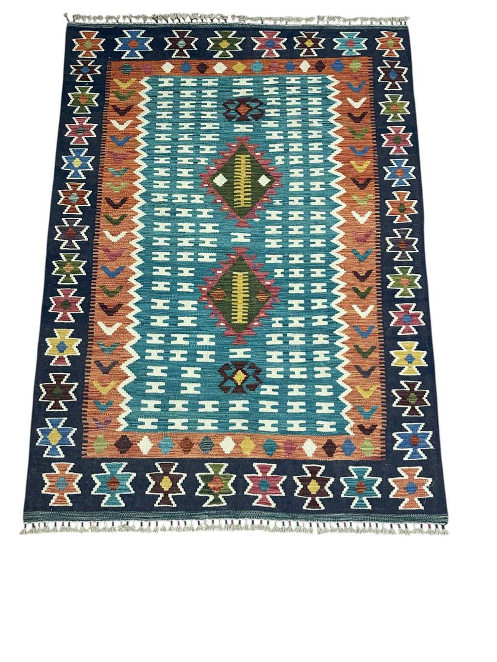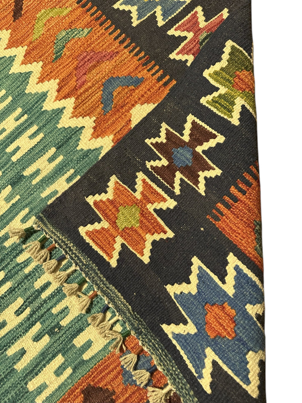 This newly made, hand-woven Kilim rug was hand-selected in Afghanistan to ensure the highest quality and authenticity. Each piece embodies generations of traditional flatweave craftsmanship. Lightweight and reversible, it is ideal for layering or use in high-traffic areas such as entryways, living rooms, or offices.
