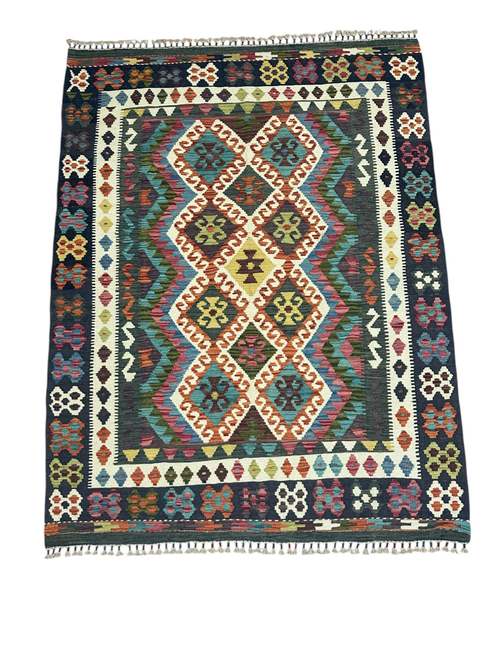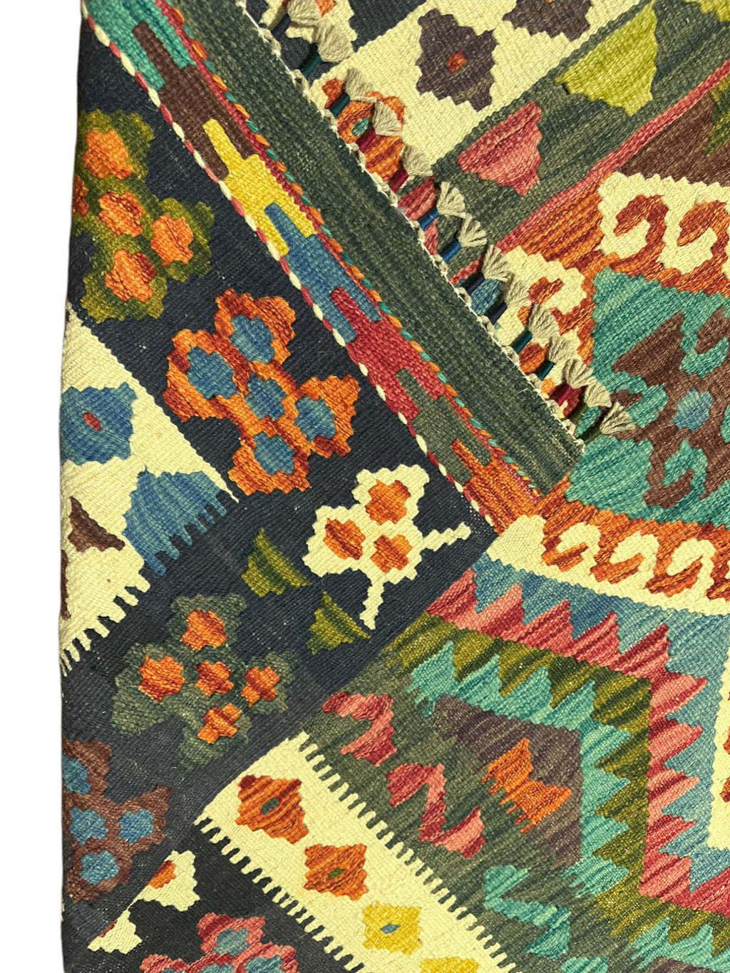 This newly made, hand-woven Kilim rug was hand-selected in Afghanistan to ensure the highest quality and authenticity. Each piece embodies generations of traditional flatweave craftsmanship. Lightweight and reversible, it is ideal for layering or use in high-traffic areas such as entryways, living rooms, or offices.