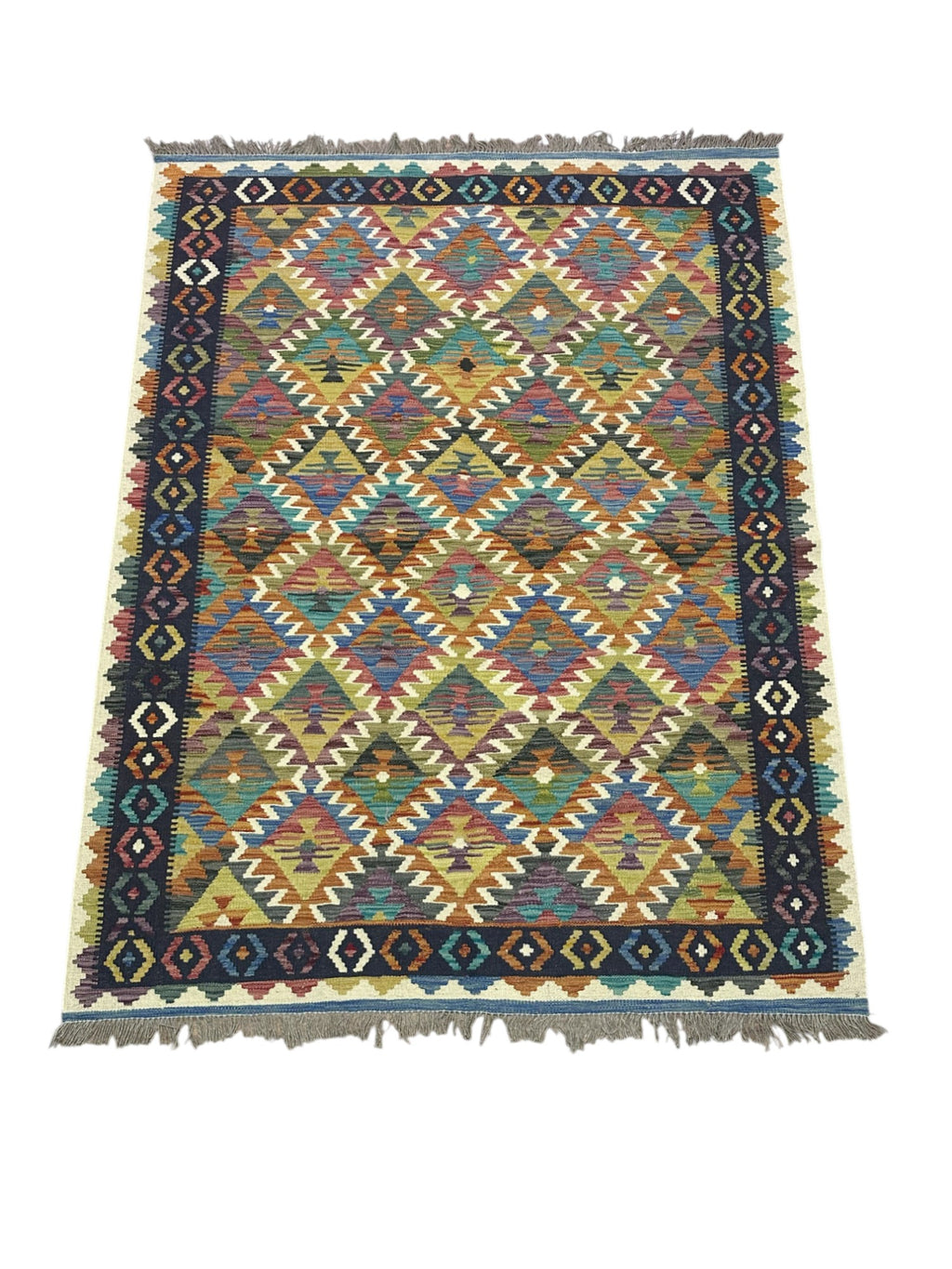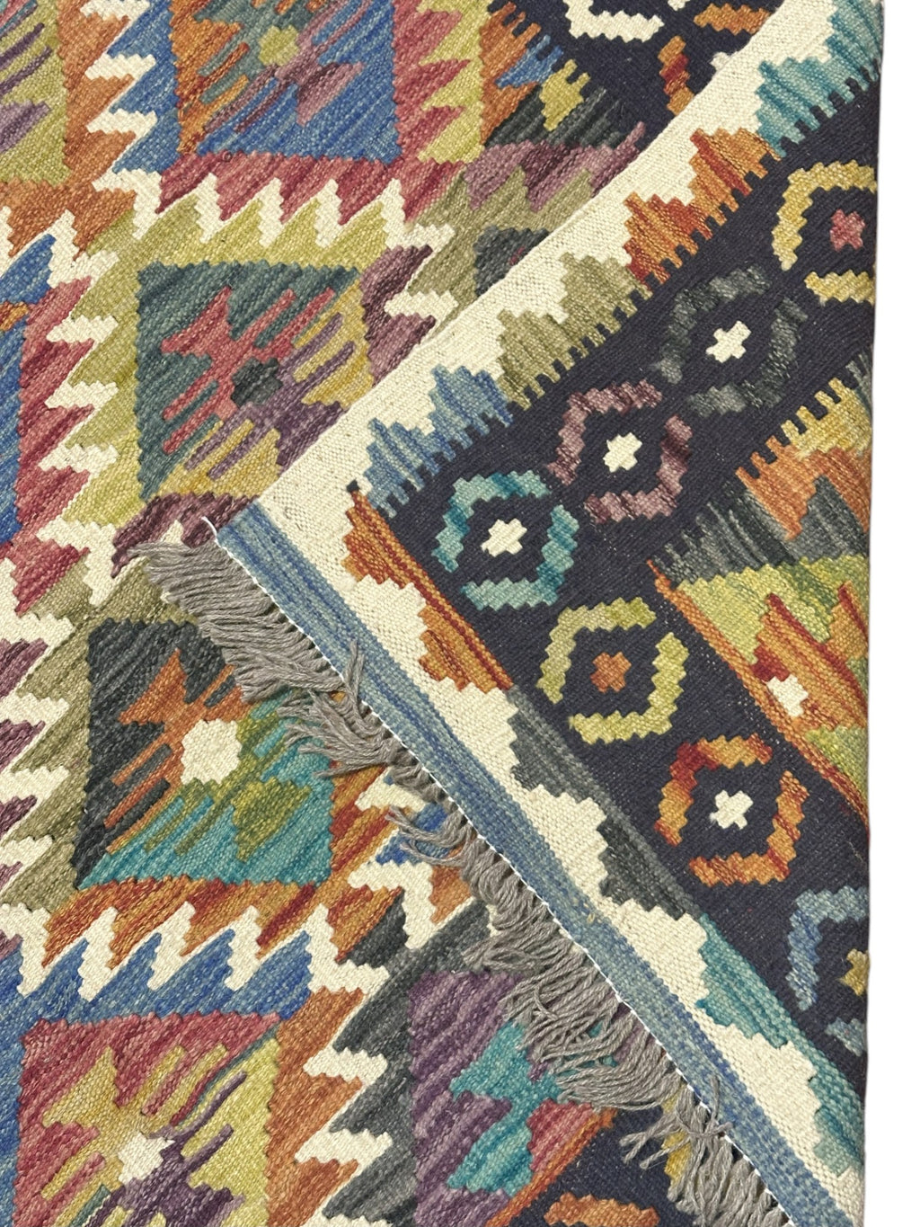 This newly made, hand-woven Kilim rug was hand-selected in Afghanistan to ensure the highest quality and authenticity. Each piece embodies generations of traditional flatweave craftsmanship. Lightweight and reversible, it is ideal for layering or use in high-traffic areas such as entryways, living rooms, or offices.