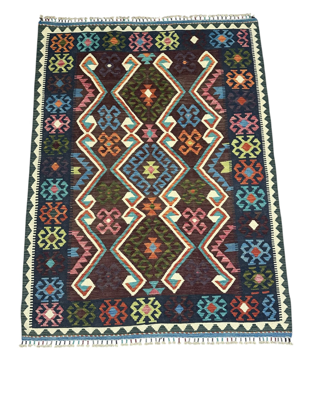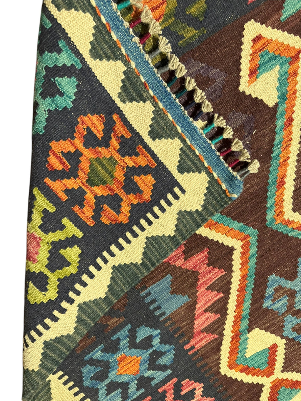 This newly made, hand-woven Kilim rug was hand-selected in Afghanistan to ensure the highest quality and authenticity. Each piece embodies generations of traditional flatweave craftsmanship. Lightweight and reversible, it is ideal for layering or use in high-traffic areas such as entryways, living rooms, or offices.