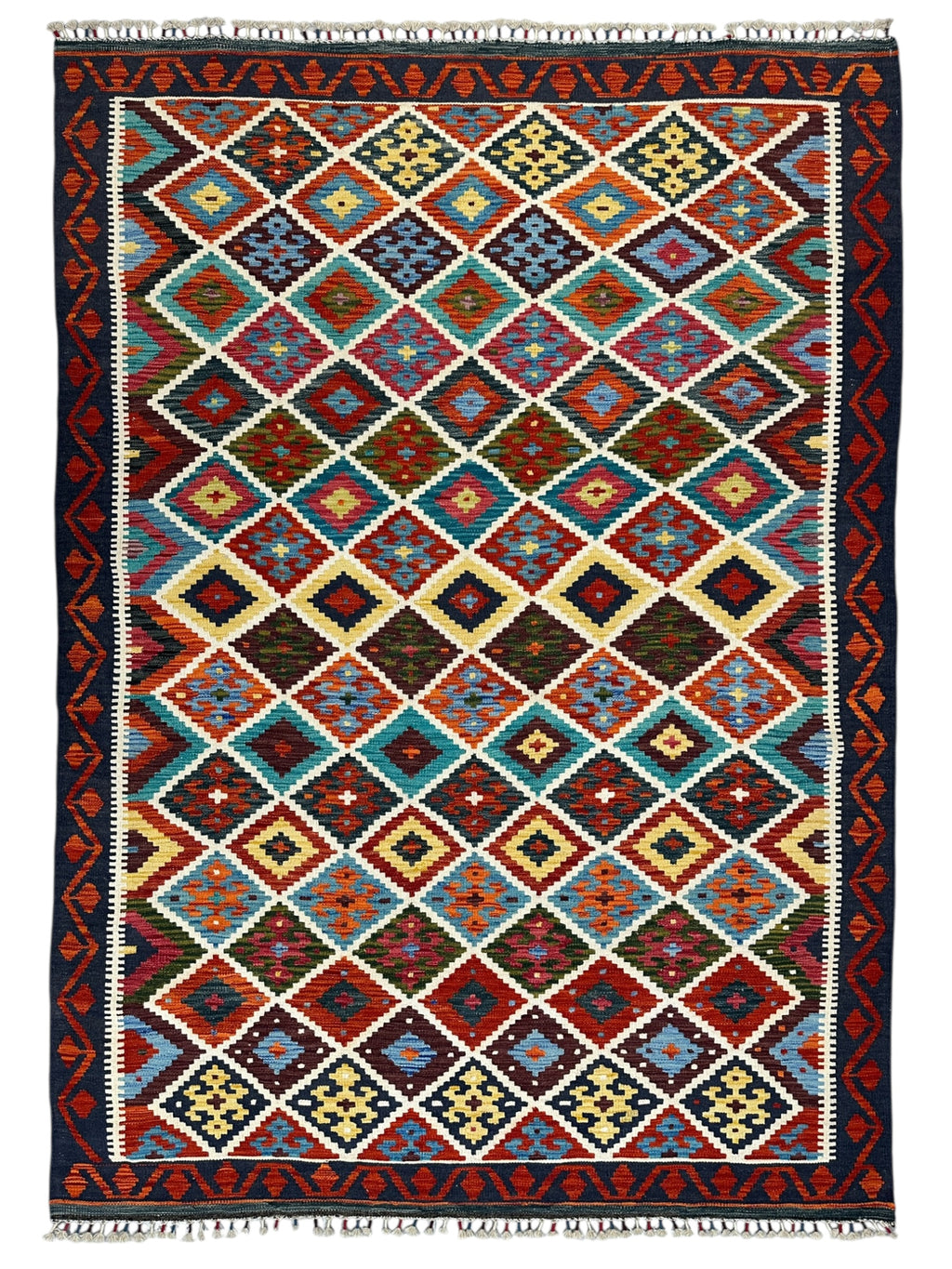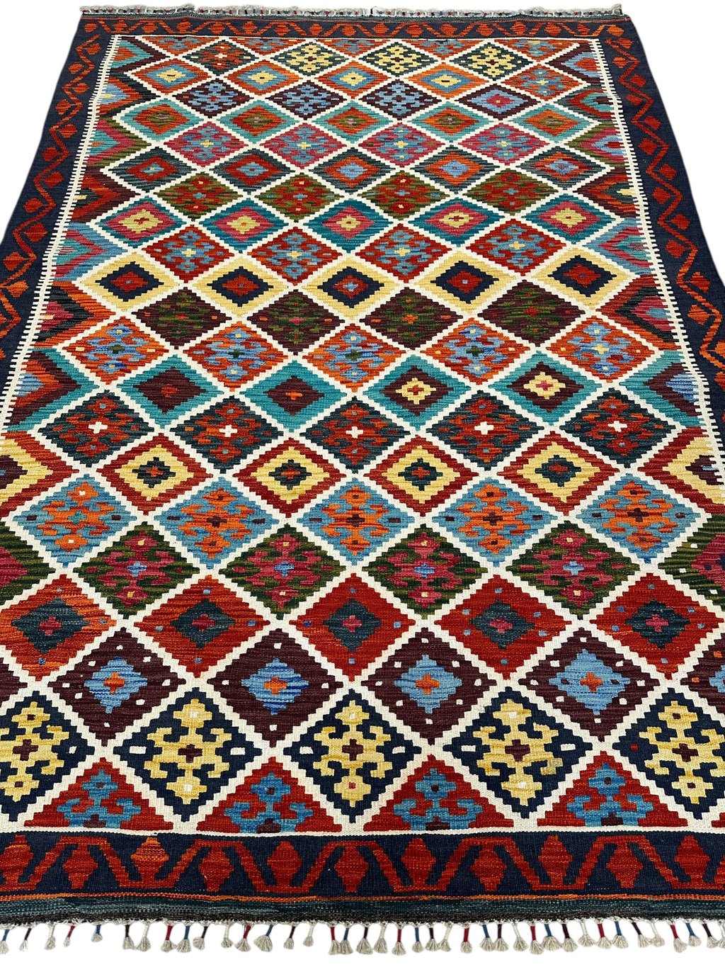 This newly made, hand-woven Kilim rug was hand-selected in Afghanistan to ensure the highest quality and authenticity. Each piece embodies generations of traditional flatweave craftsmanship. Lightweight and reversible, it is ideal for layering or use in high-traffic areas such as entryways, living rooms, or offices.