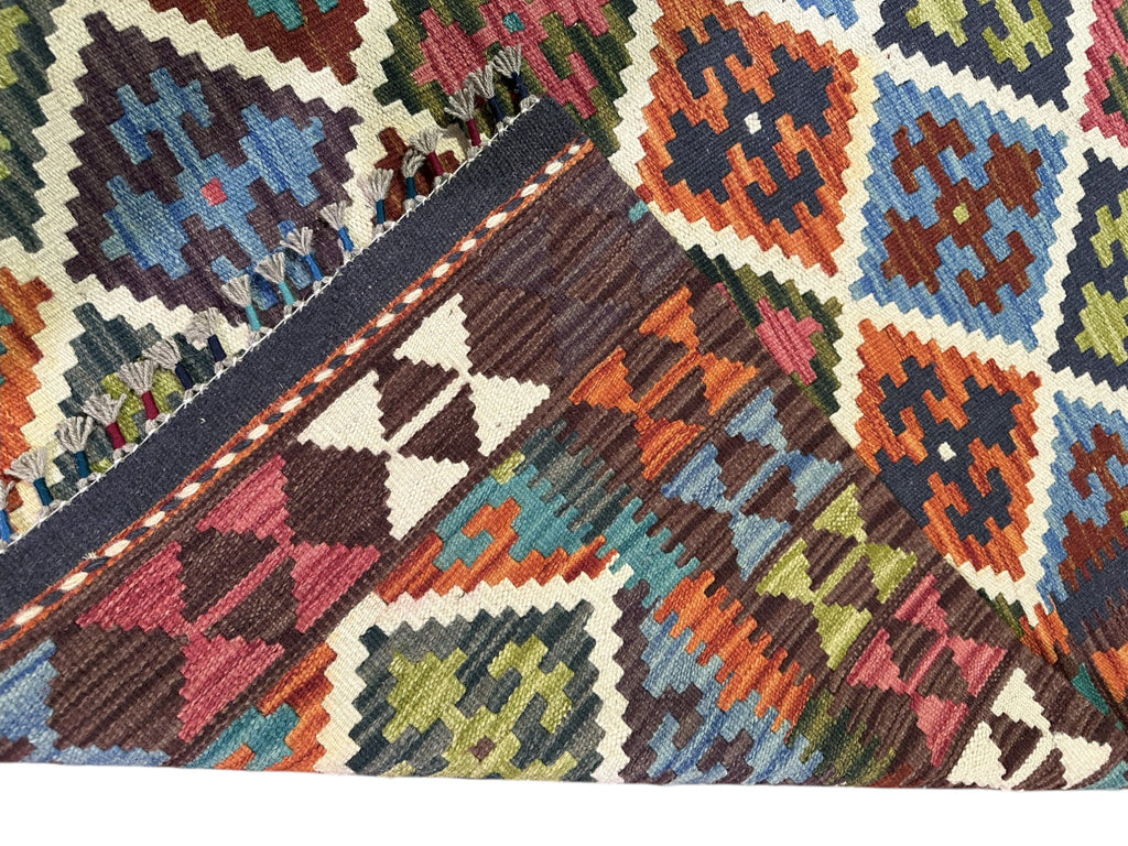This newly made, hand-woven Kilim rug was hand-selected in Afghanistan to ensure the highest quality and authenticity. Each piece embodies generations of traditional flatweave craftsmanship. Lightweight and reversible, it is ideal for layering or use in high-traffic areas such as entryways, living rooms, or offices.