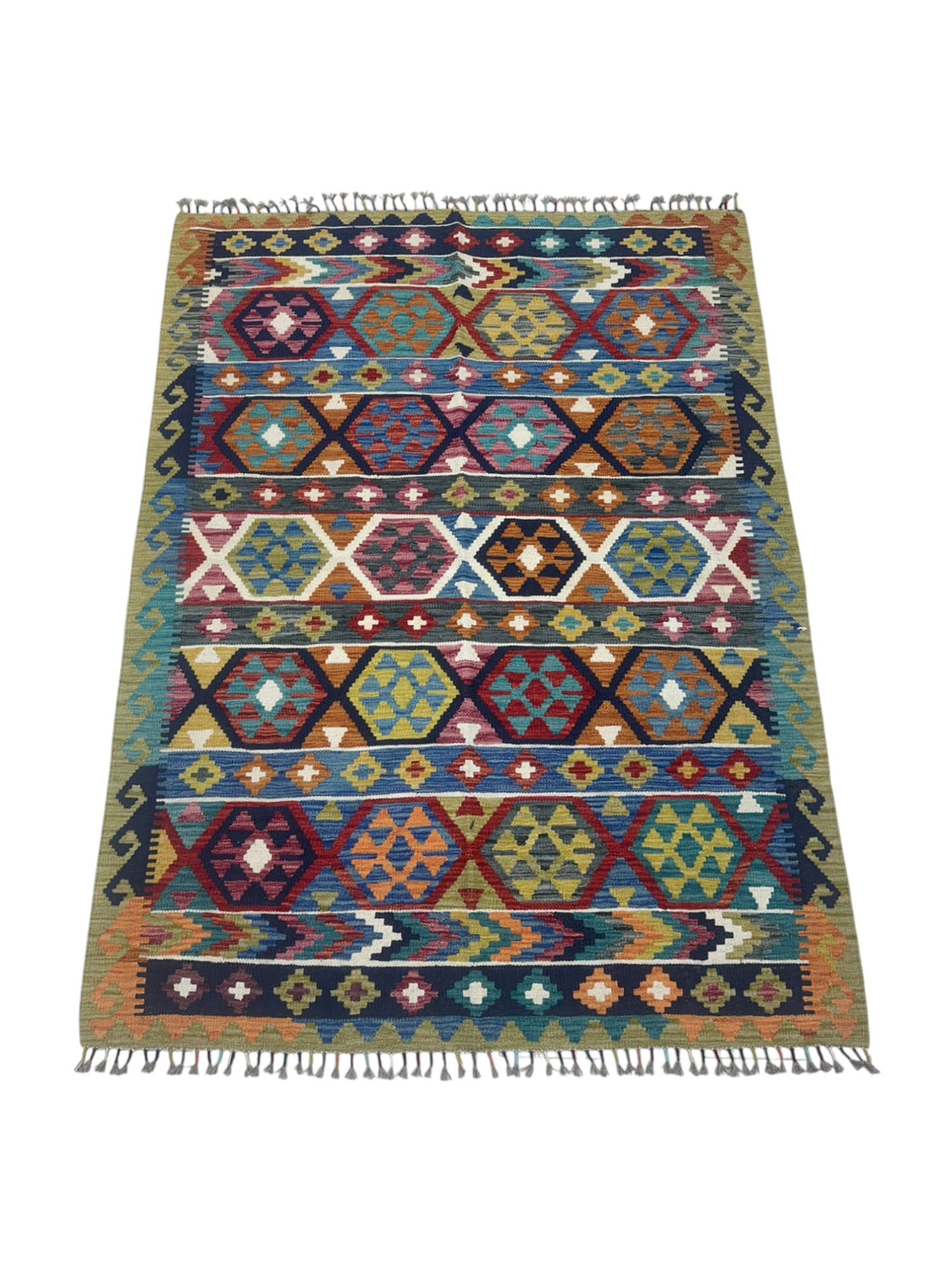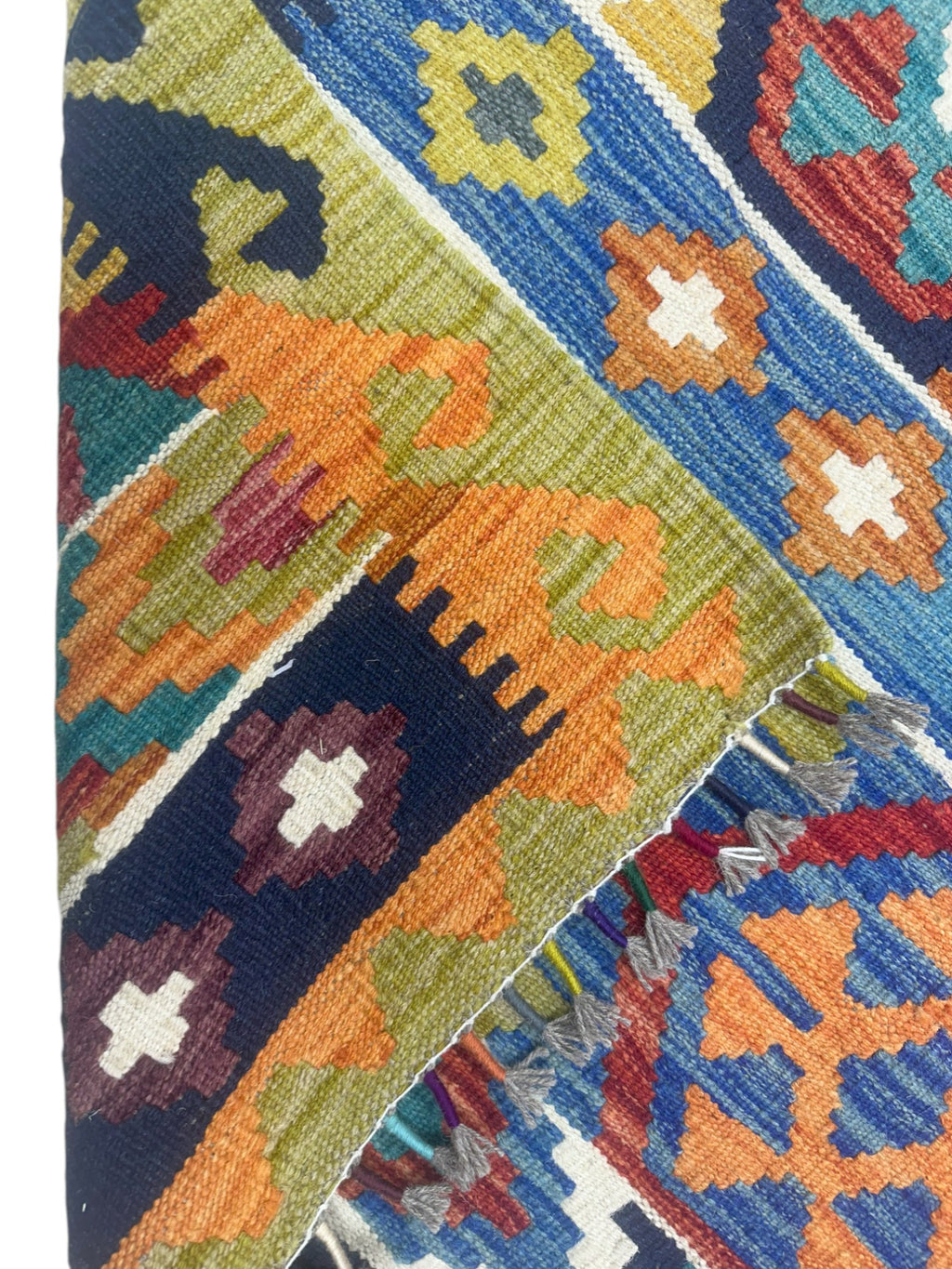 This newly made, hand-woven Kilim rug was hand-selected in Afghanistan to ensure the highest quality and authenticity. Each piece embodies generations of traditional flatweave craftsmanship. Lightweight and reversible, it is ideal for layering or use in high-traffic areas such as entryways, living rooms, or offices.