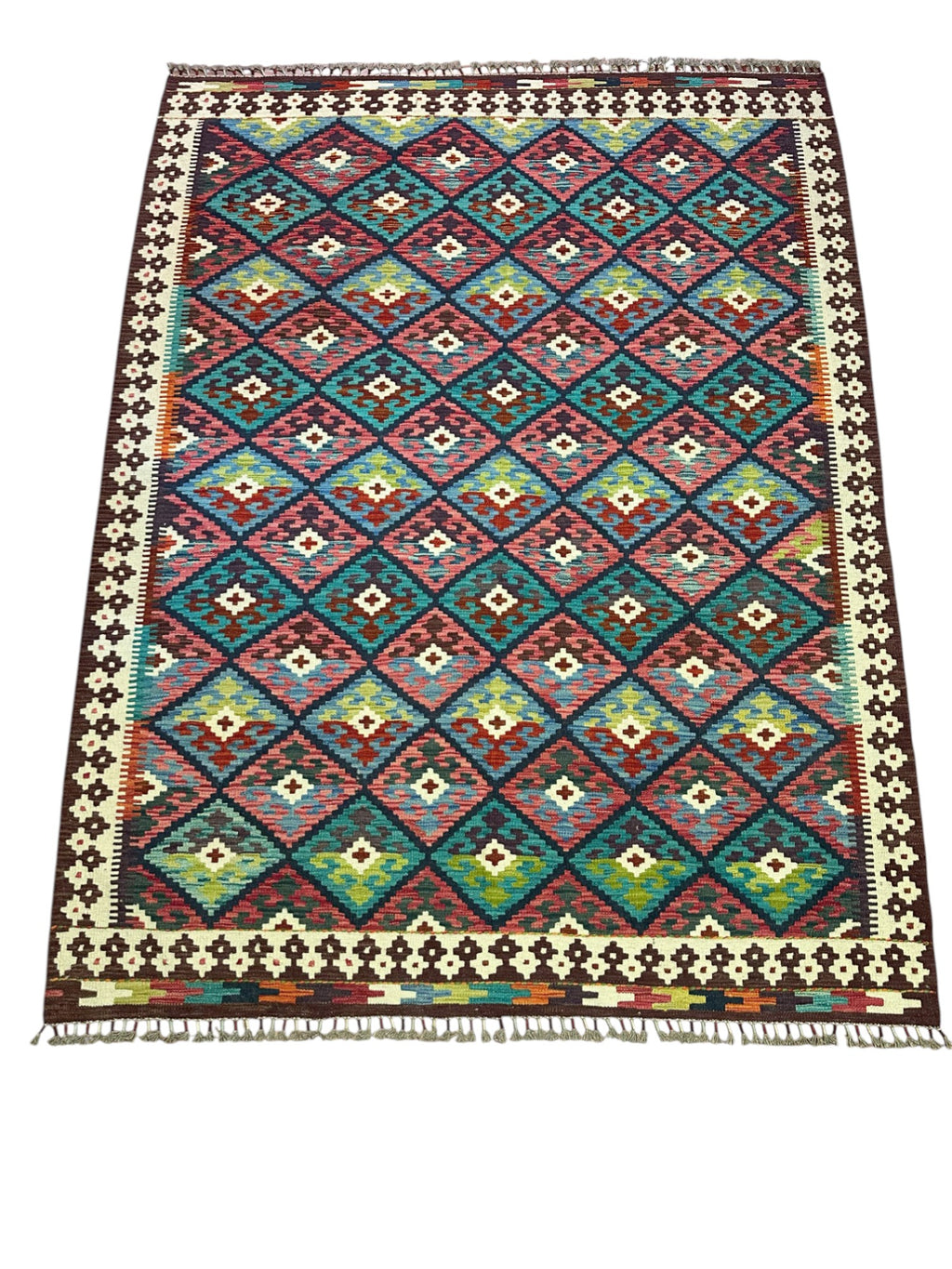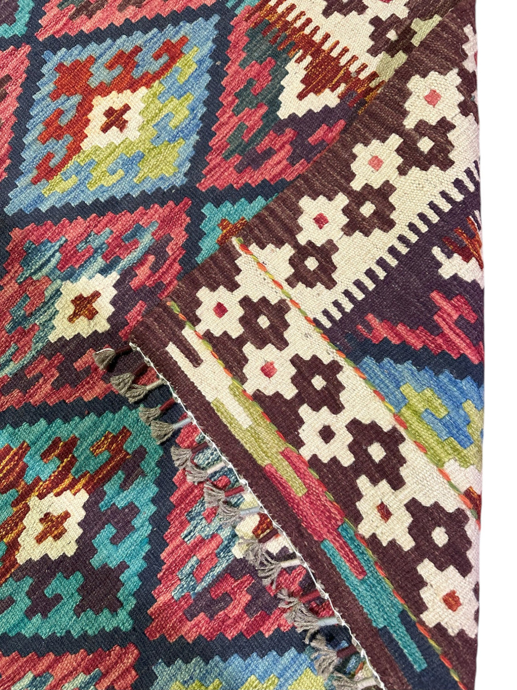 This newly made, hand-woven Kilim rug was hand-selected in Afghanistan to ensure the highest quality and authenticity. Each piece embodies generations of traditional flatweave craftsmanship. Lightweight and reversible, it is ideal for layering or use in high-traffic areas such as entryways, living rooms, or offices.