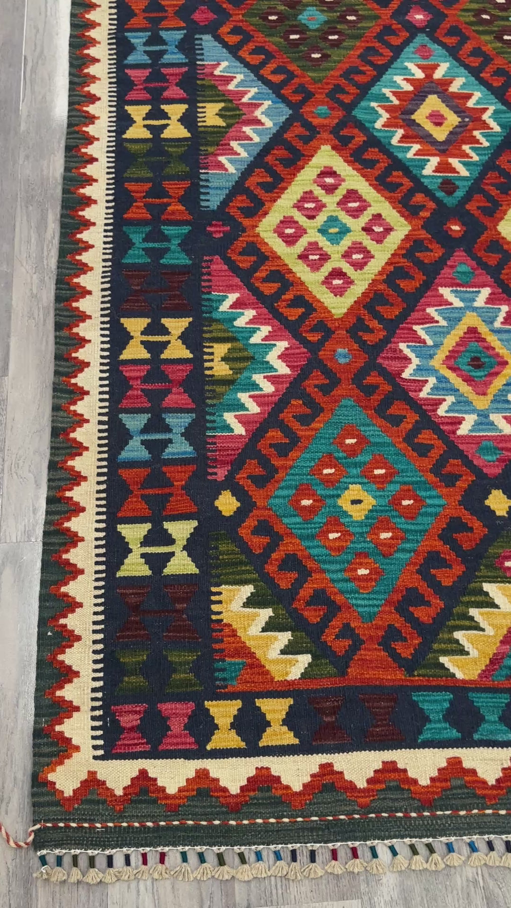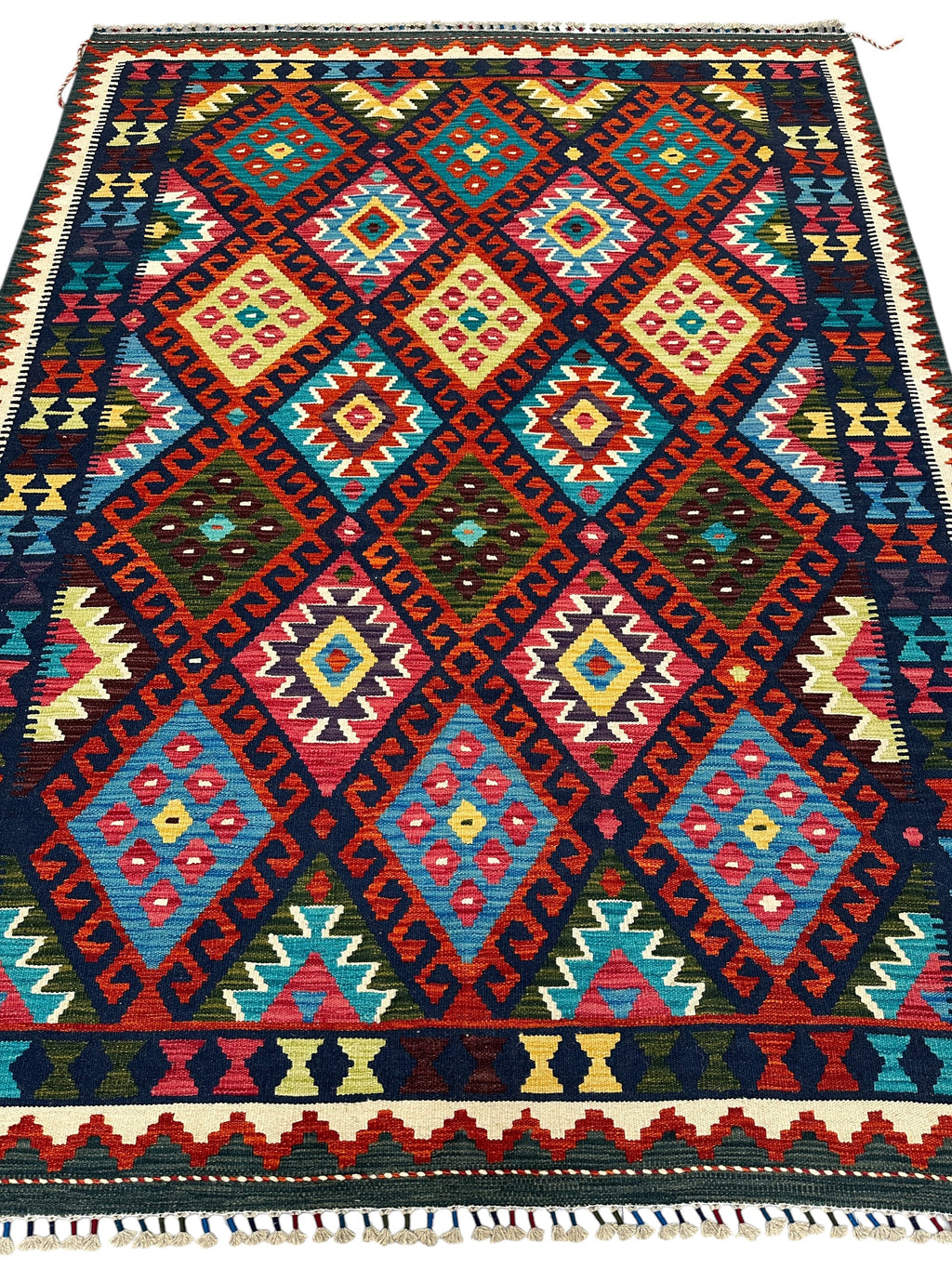 This newly made, hand-woven Kilim rug was hand-selected in Afghanistan to ensure the highest quality and authenticity. Each piece embodies generations of traditional flatweave craftsmanship. Lightweight and reversible, it is ideal for layering or use in high-traffic areas such as entryways, living rooms, or offices.