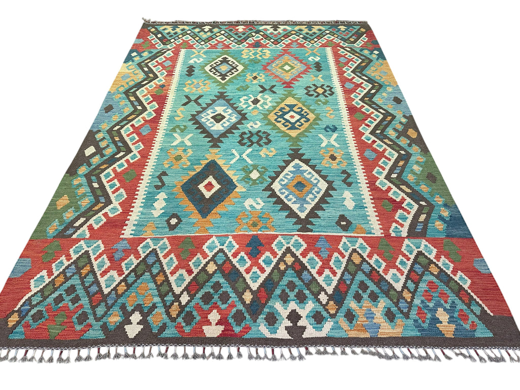 This newly made, hand-woven Kilim rug was hand-selected in Afghanistan to ensure the highest quality and authenticity. Each piece embodies generations of traditional flatweave craftsmanship. Lightweight and reversible, it is ideal for layering or use in high-traffic areas such as entryways, living rooms, or offices.