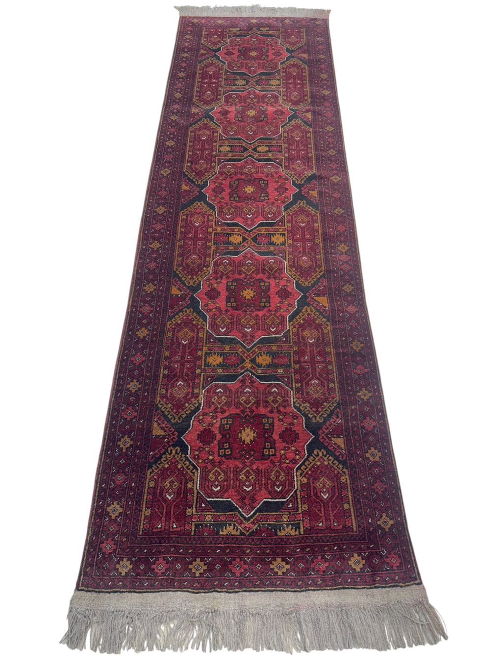 Enhance your space with this hand-knotted traditional runner rug, crafted by Afghan artisans using rich Red, Black hues. This runner rug is perfect for hallways, entryways, or long spaces, offering durability and warmth through premium wool and heritage design. Each piece is one-of-a-kind and carries the story of traditional craftsmanship.