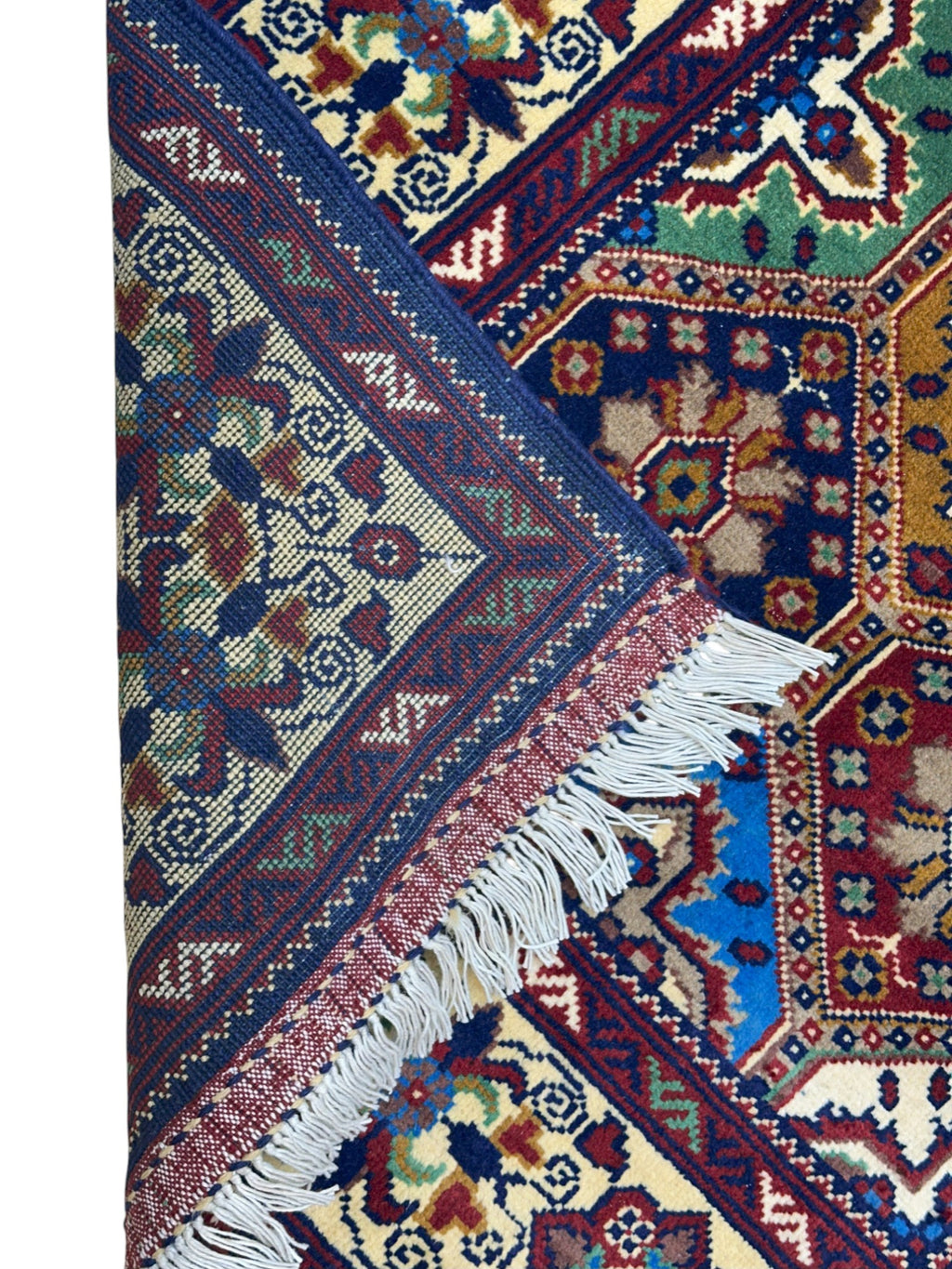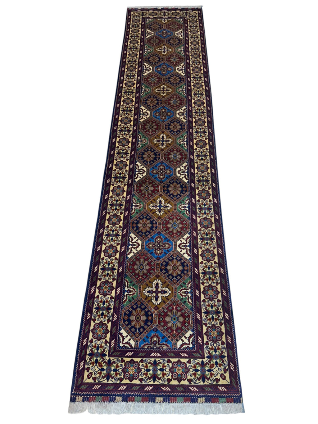 Enhance your space with this hand-knotted kashi runner rug, crafted by Afghan artisans using rich Cream, Red, Blue hues. This runner rug is perfect for hallways, entryways, or long spaces, offering durability and warmth through premium wool and heritage design. Each piece is one-of-a-kind and carries the story of traditional craftsmanship.
