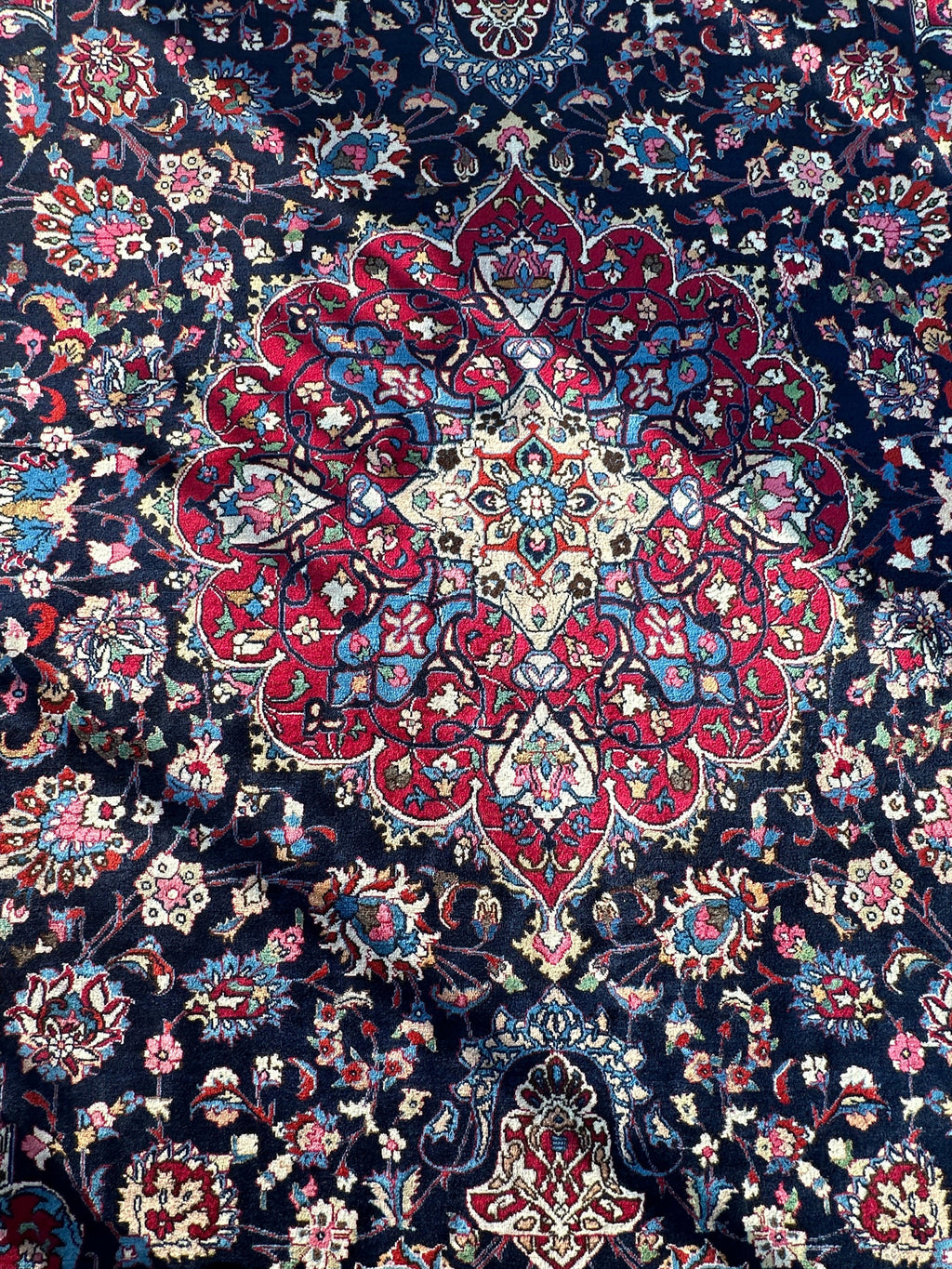 Elevate your space with the stunning and unique Persian Mashhad Hand Knotted Wool Area Rug. Hand-knotted in the 1970s and made from 100% natural wool, this pre-loved rug features a beautiful Mashhad design and stands at 9'9" x 13'3" with a 0.5" height. It adds extra character and beauty to any room, making it a must-have statement piece. Get it professionally cleaned and watch it bring a glow to your place.